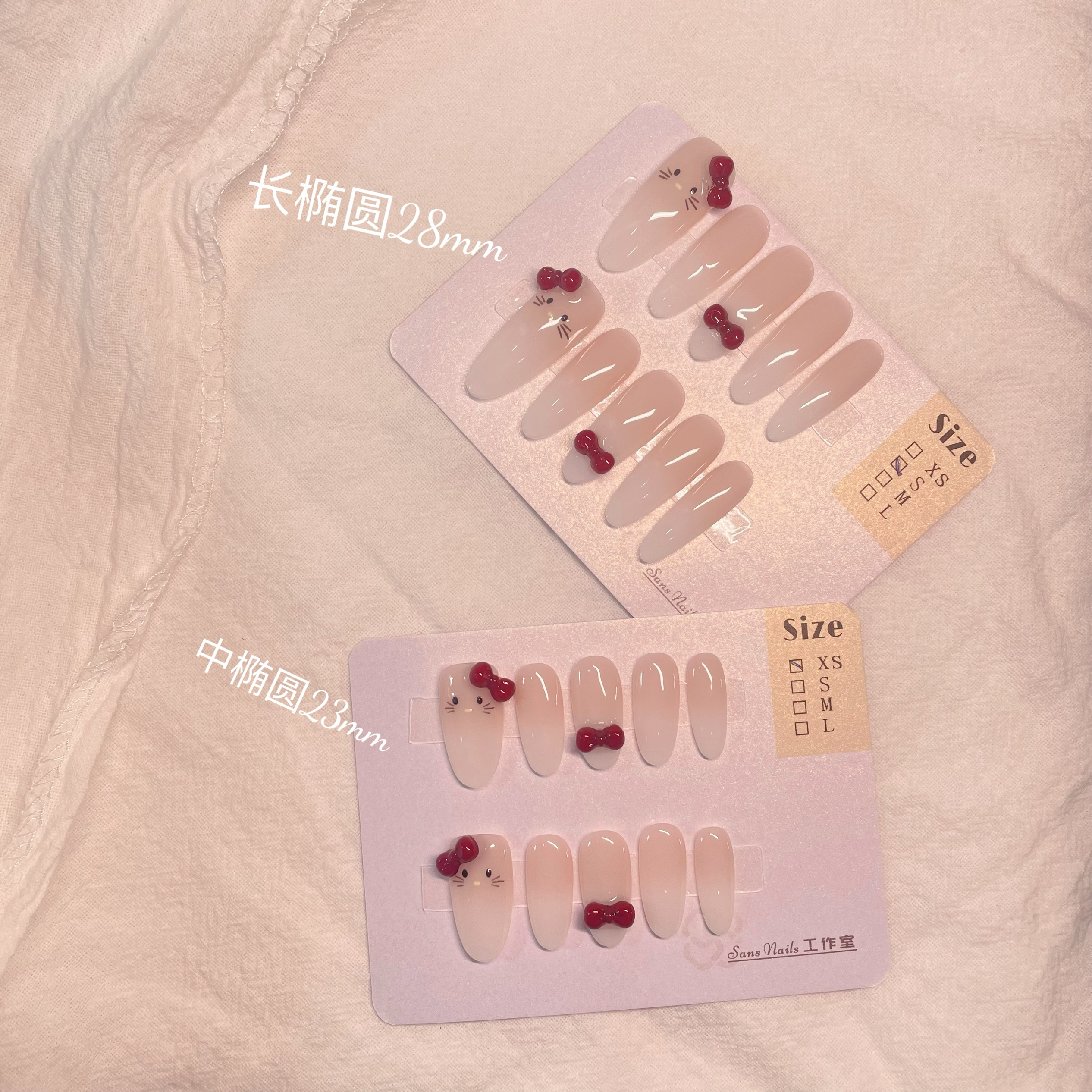 2025新款手工穿戴甲乳白渐变高级感可爱kitty猫红蝴蝶结美甲气质