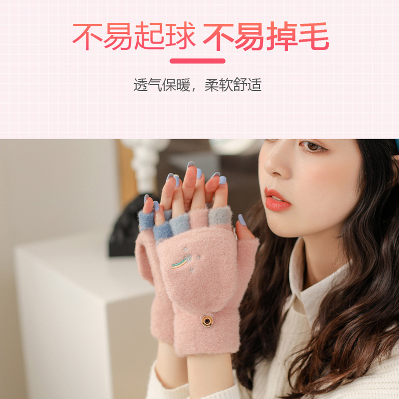 半指翻盖手套冬季女士可爱加绒防寒保暖毛线秋冬露指学生写字手套