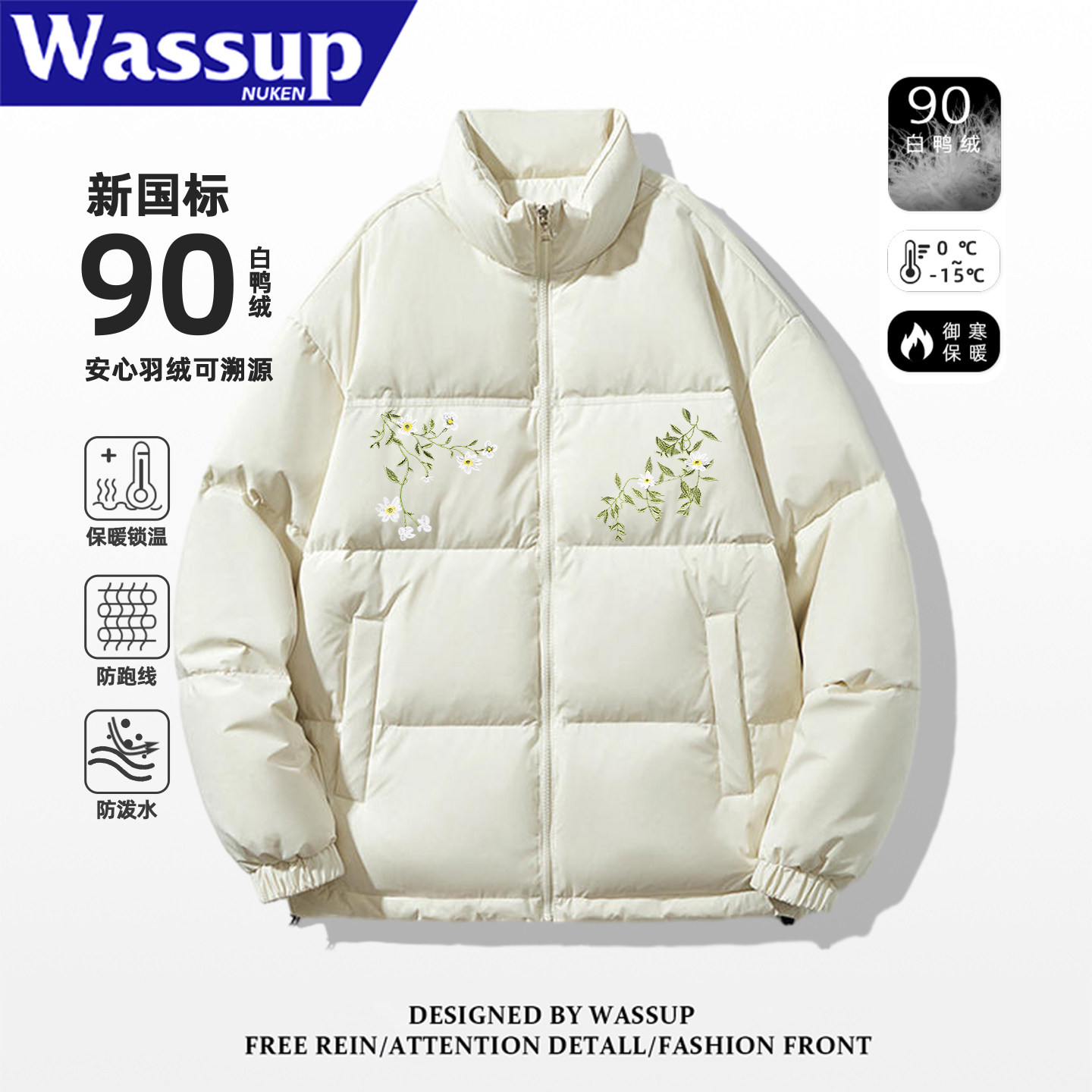 WASSUP美式街头复古白鸭绒羽绒服男冬季潮流花卉印花加厚保暖外套