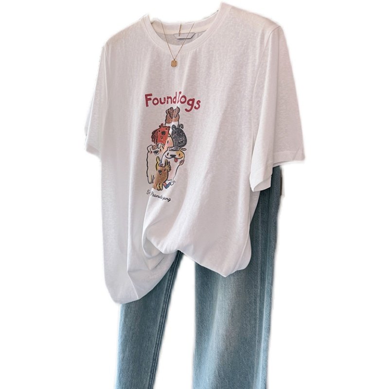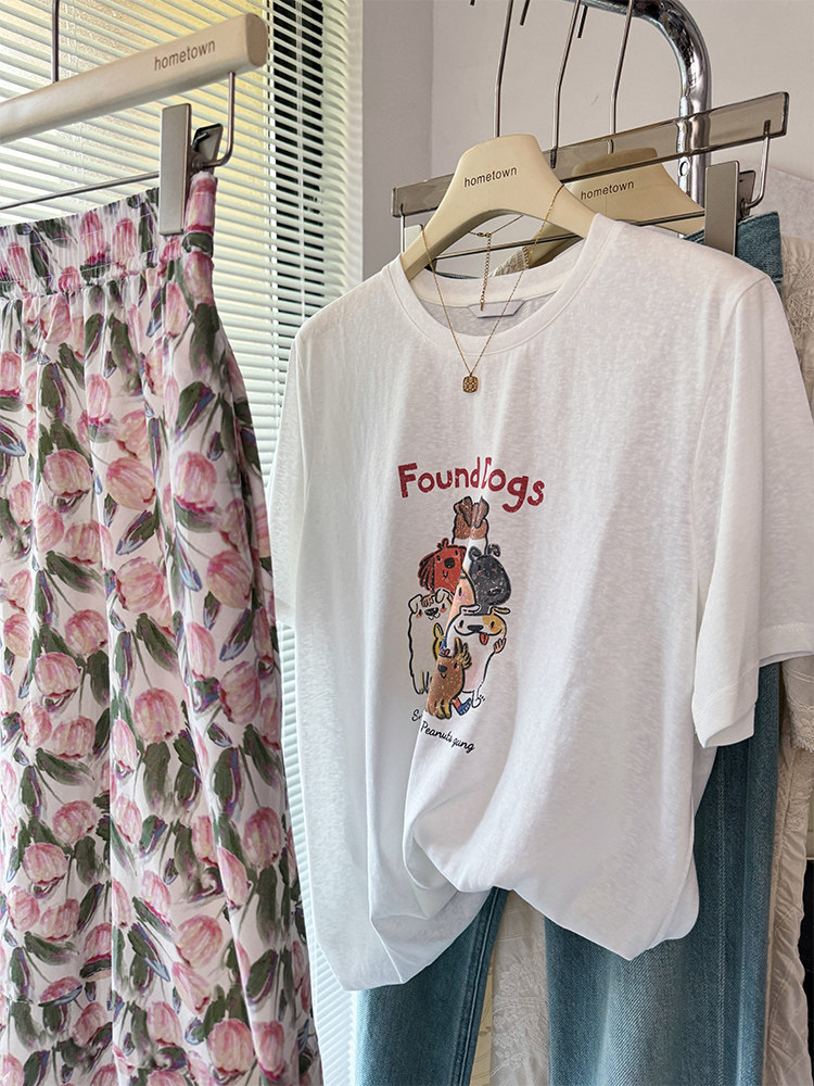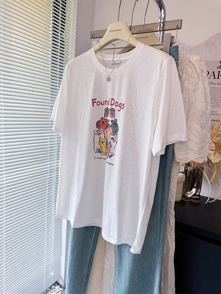 韩版时髦卡通印花正肩宽松显瘦凉爽雪花棉白色短袖T恤女薄上衣夏