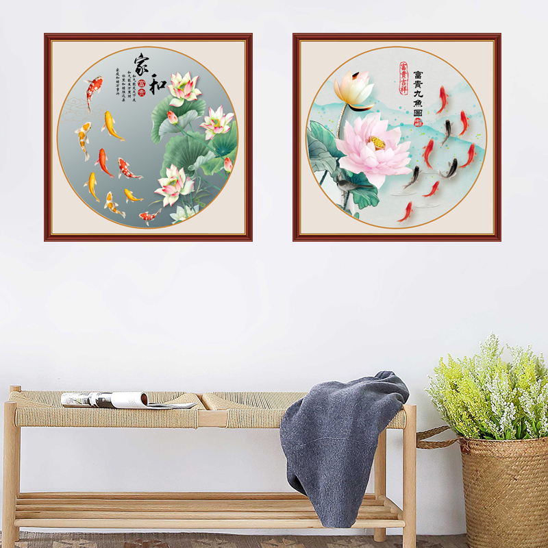 客厅装饰画梅兰竹菊正方形墙贴画卧室床头自粘画九鱼图山水风景画