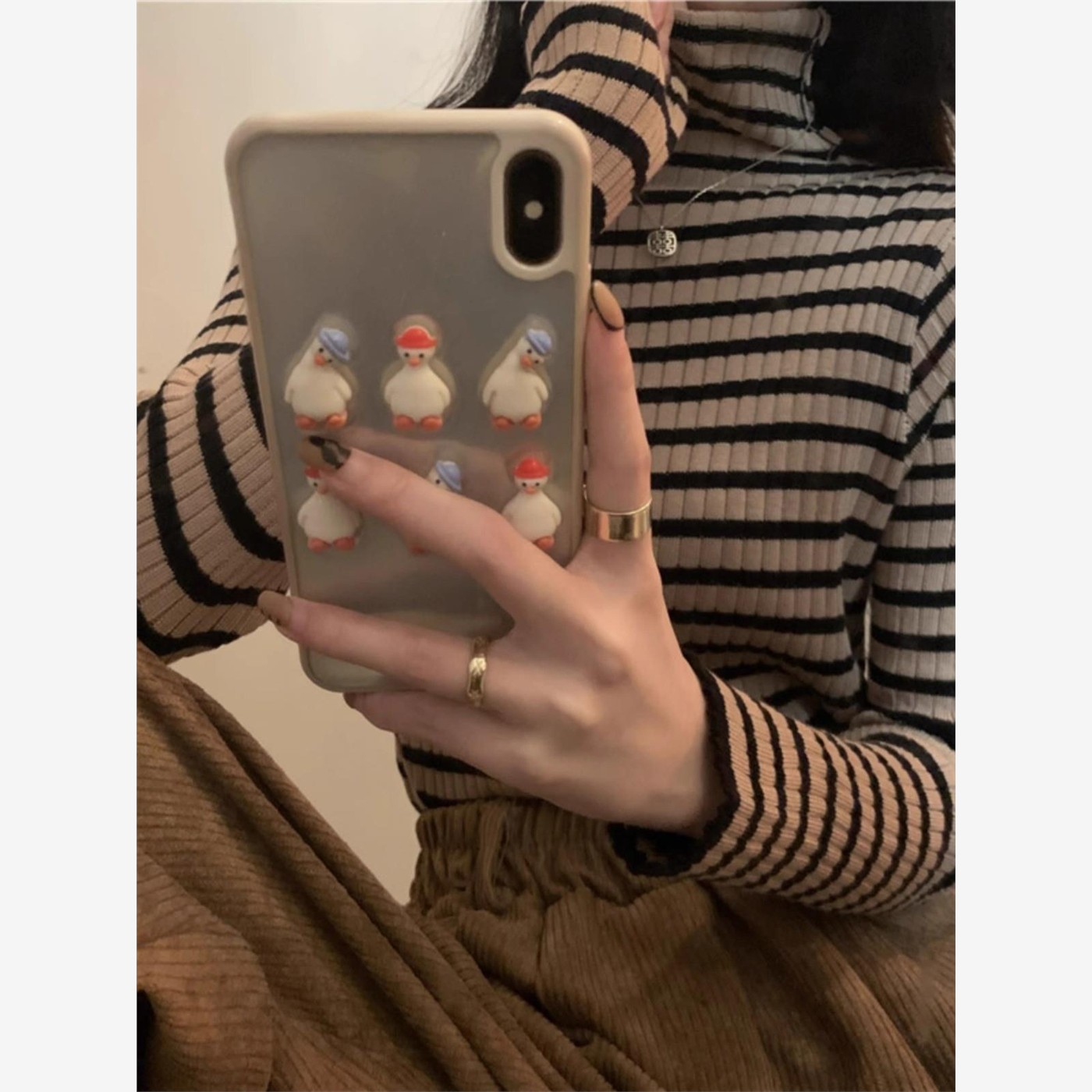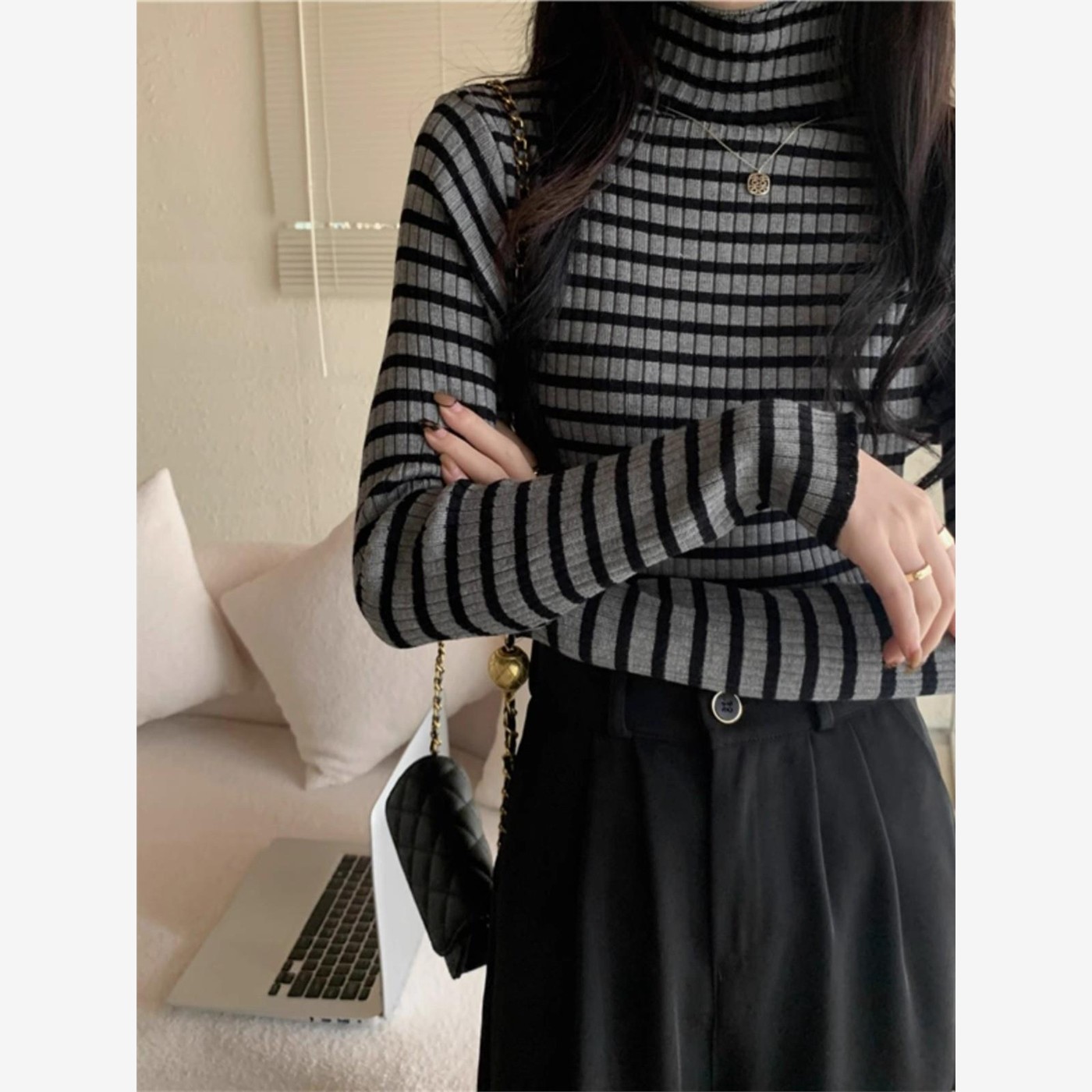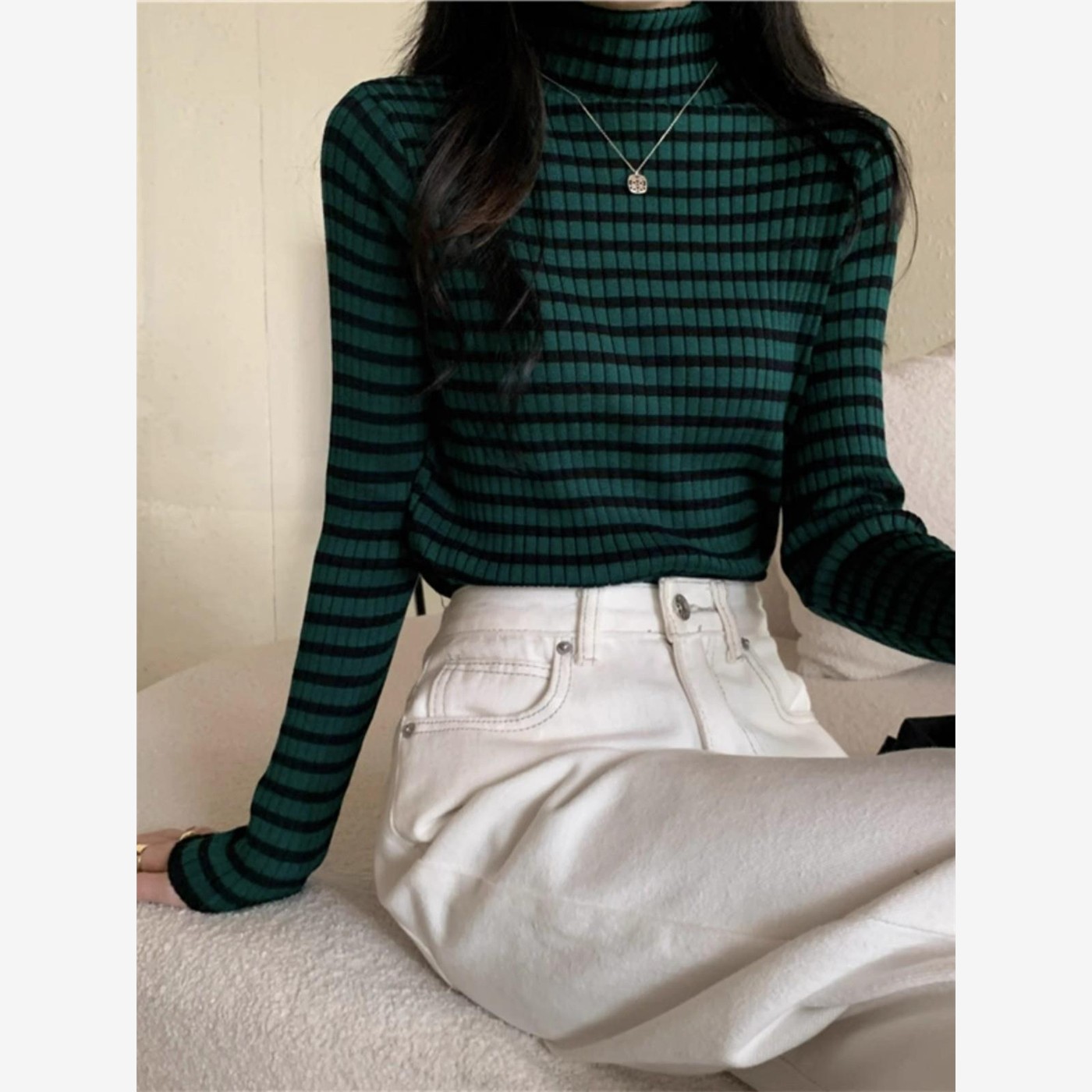 高领内搭毛衣打底衫女秋冬季新款高级感撞色条纹修身针织长袖上衣