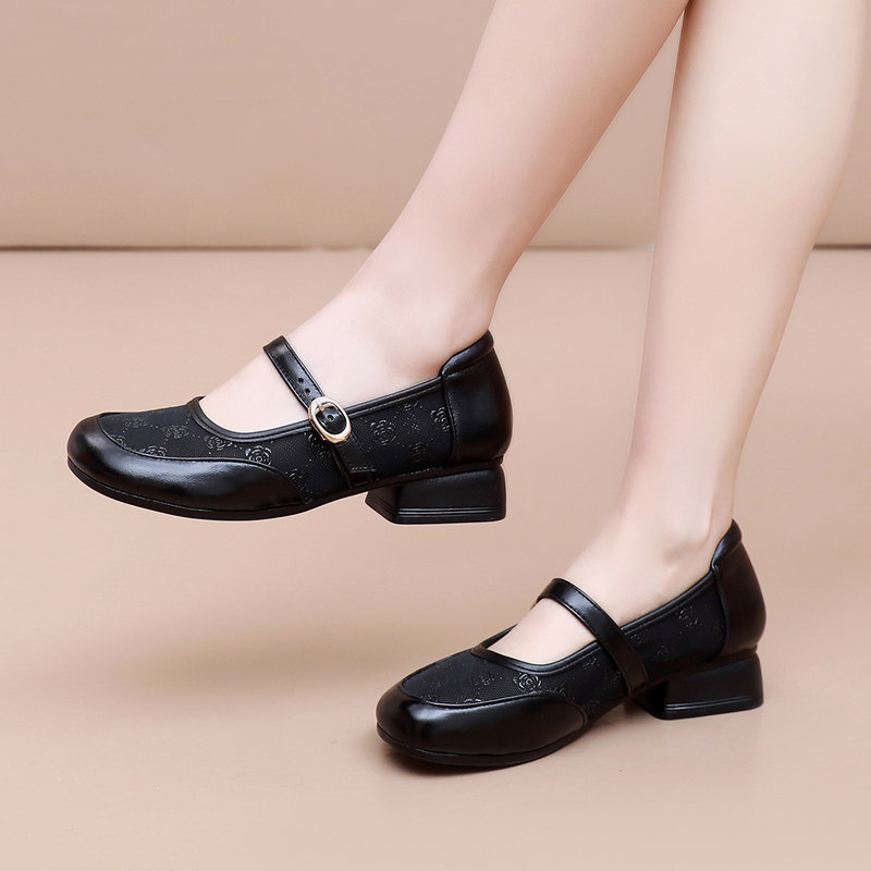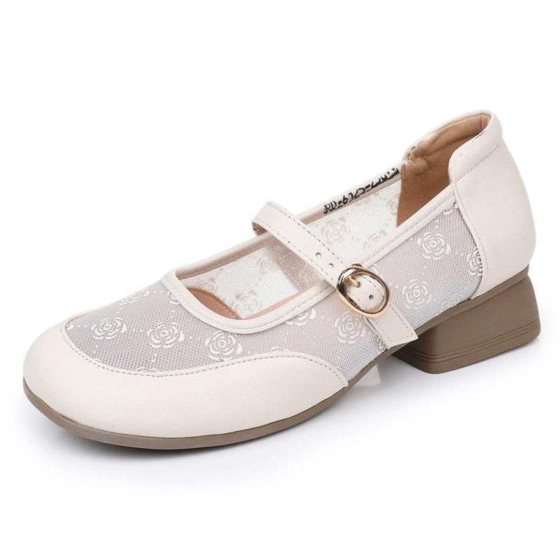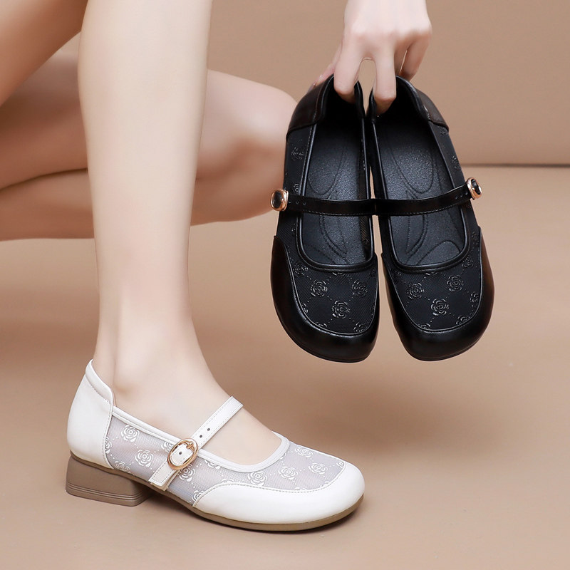 真皮网纱单鞋透气镂空玛丽珍鞋包头凉鞋女夏季新款粗跟软底妈妈鞋