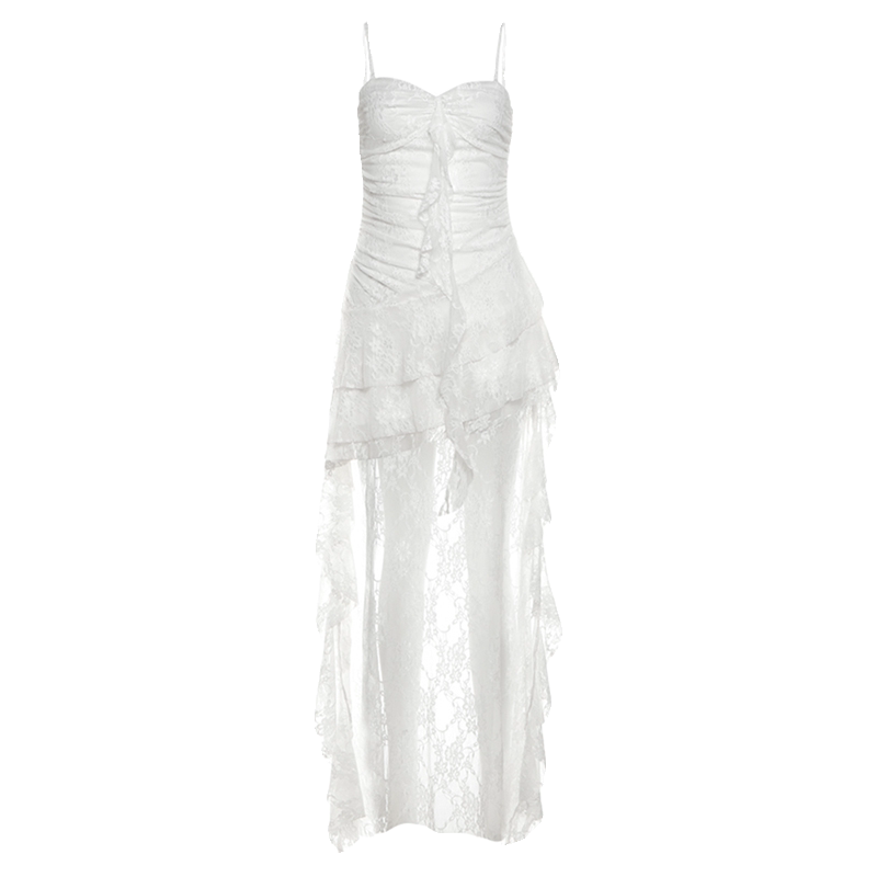 WEIRD PUSS 夏日茶歇仙女风蕾丝钩花层次感修身性感拖尾连衣裙女