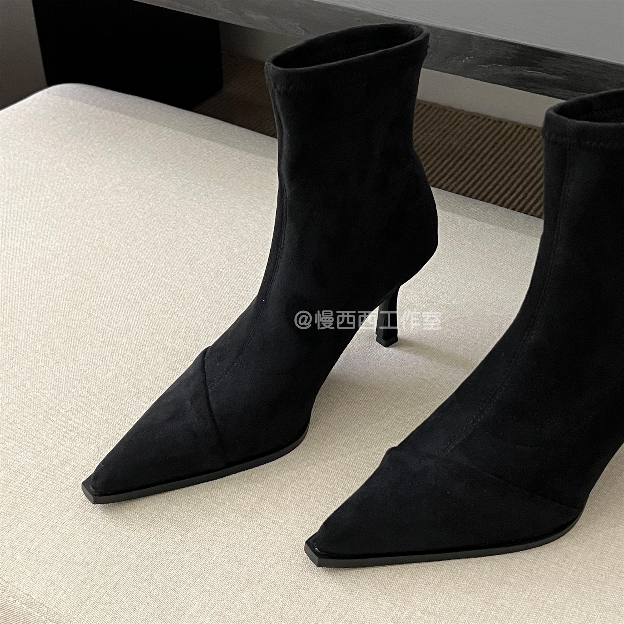 软面高跟尖头绒面卡其色瘦瘦靴短靴2024秋冬新款单靴韩系小裸靴子