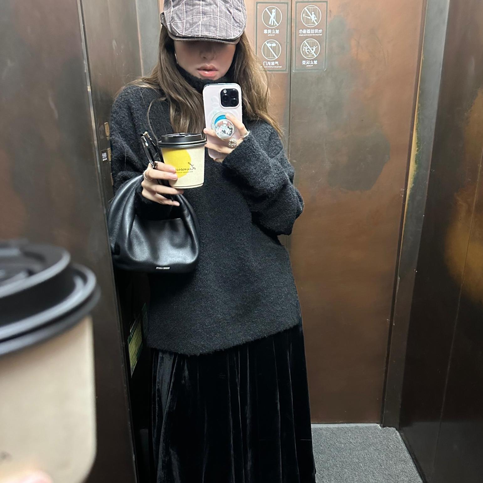 3ts黑色丝绒大摆裙半身裙秋冬季百褶裙显瘦a字裙中长款冬裙