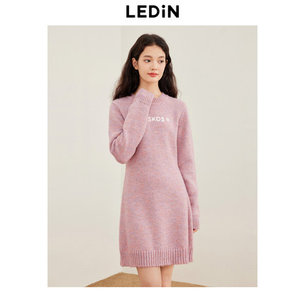 乐町复古粉色毛衣裙女新年冬季新款收腰X版长袖裙圆领内搭连衣裙