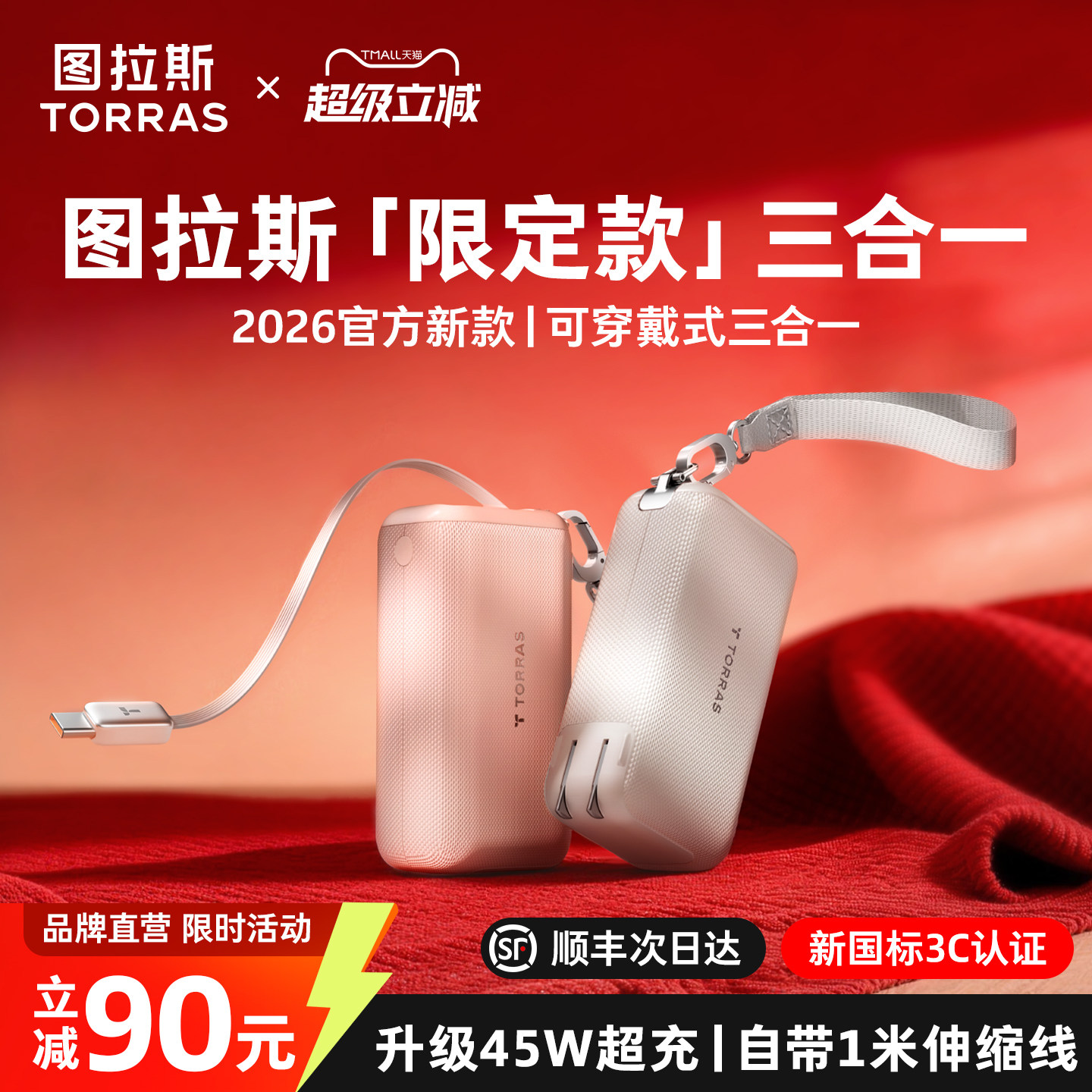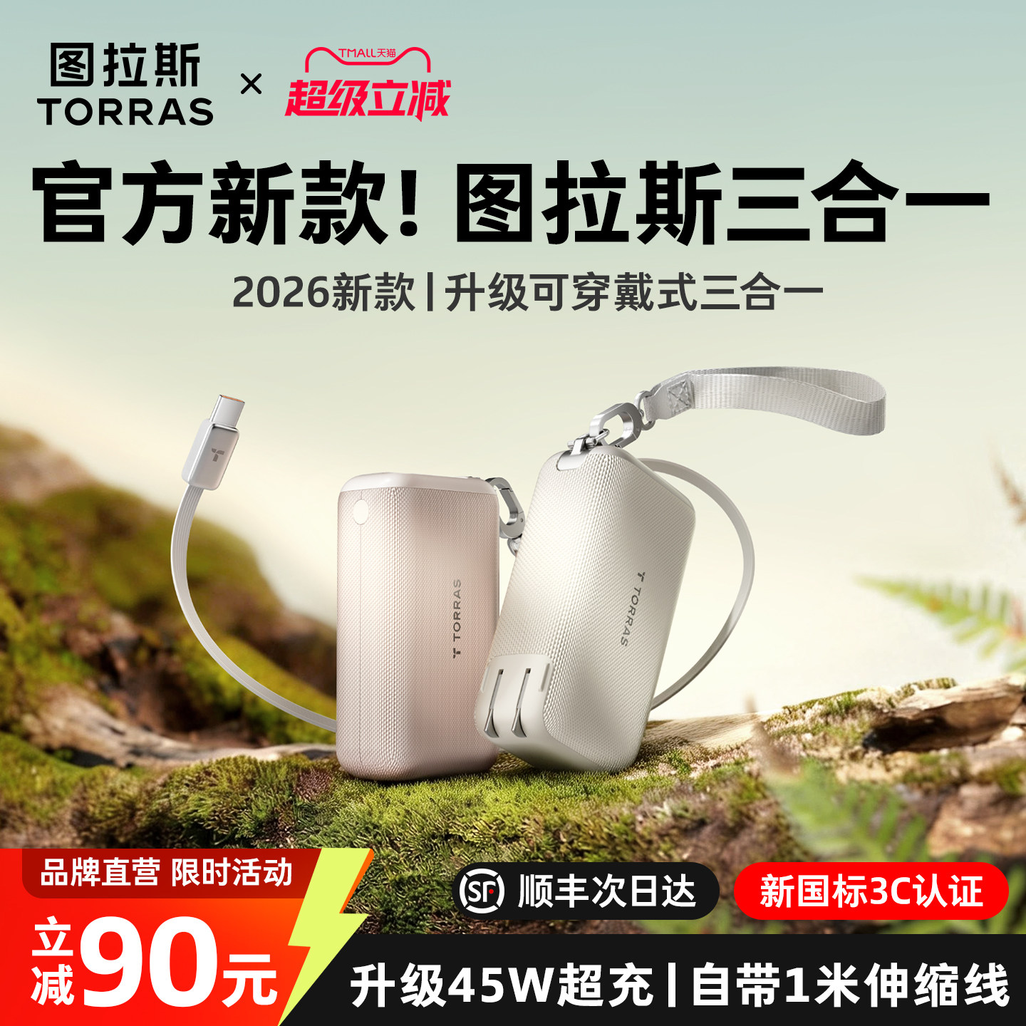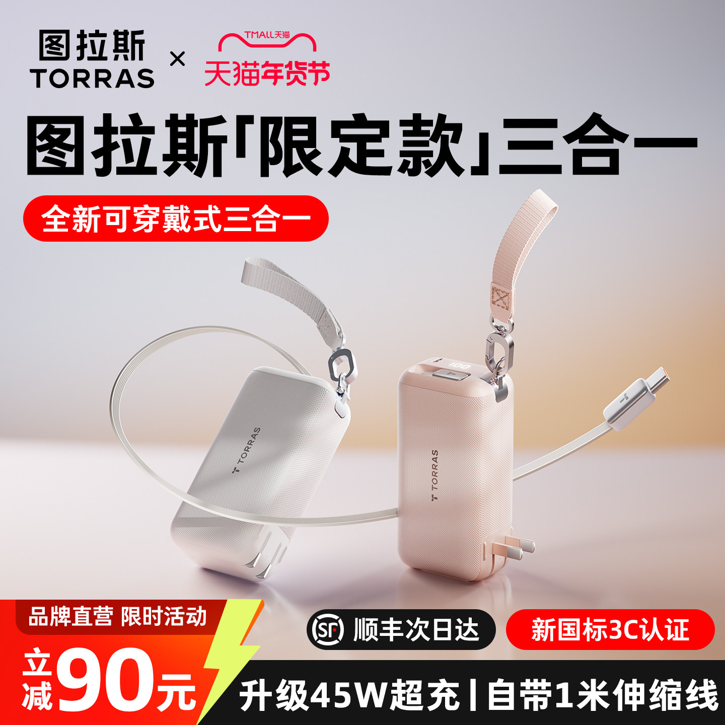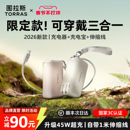 图拉斯可穿戴三合一随心充Pro充电宝器2026新款3C认证可上飞机快充小巧适用苹果17移动电源带插头伸缩线官方6