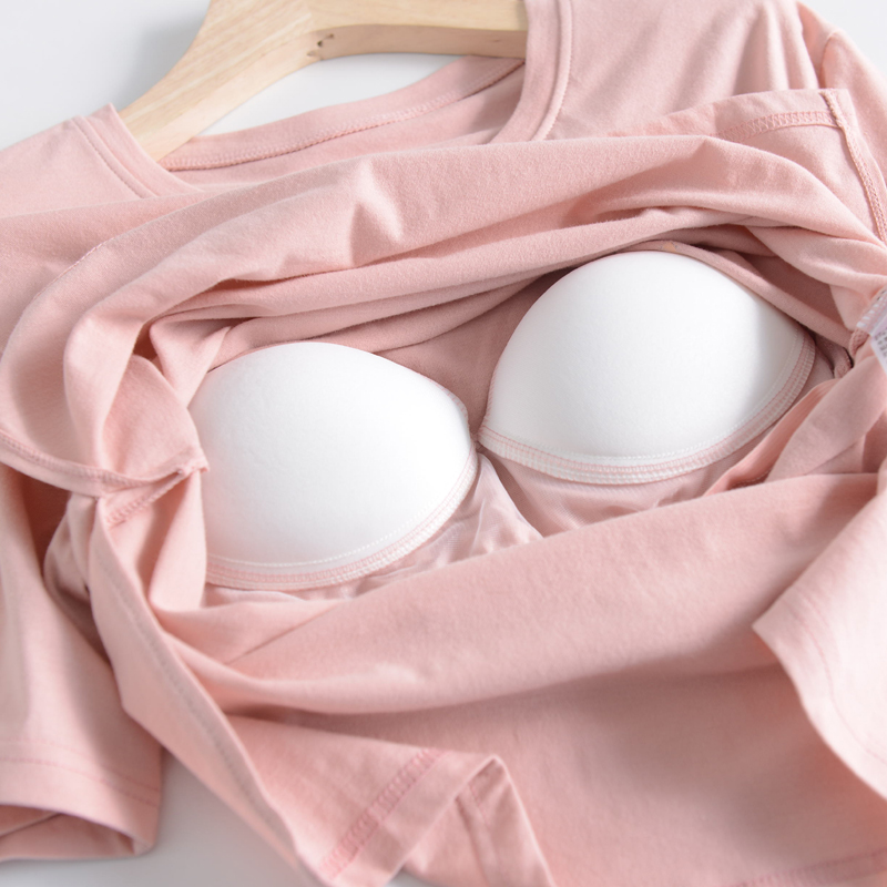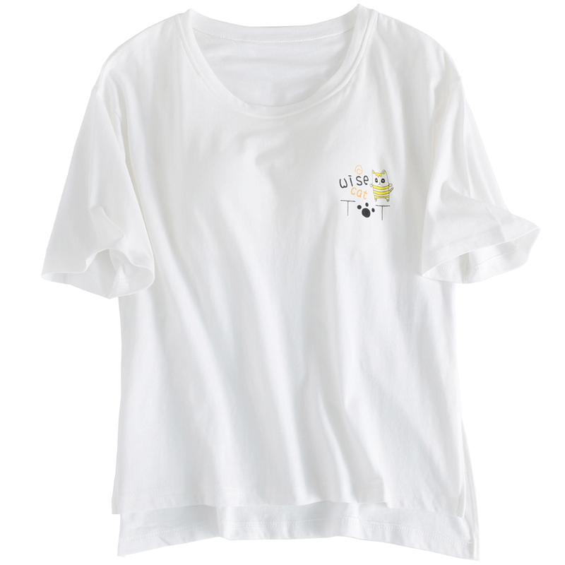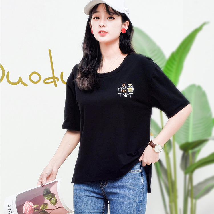 女夏季纯棉带胸垫短袖T恤衫宽松款韩版印花长款半袖大码上衣外穿