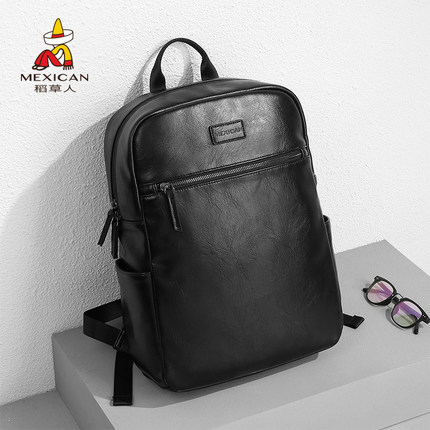 稻草人双肩包男休闲大容量电脑背包软皮高中大学生书包潮官方正品