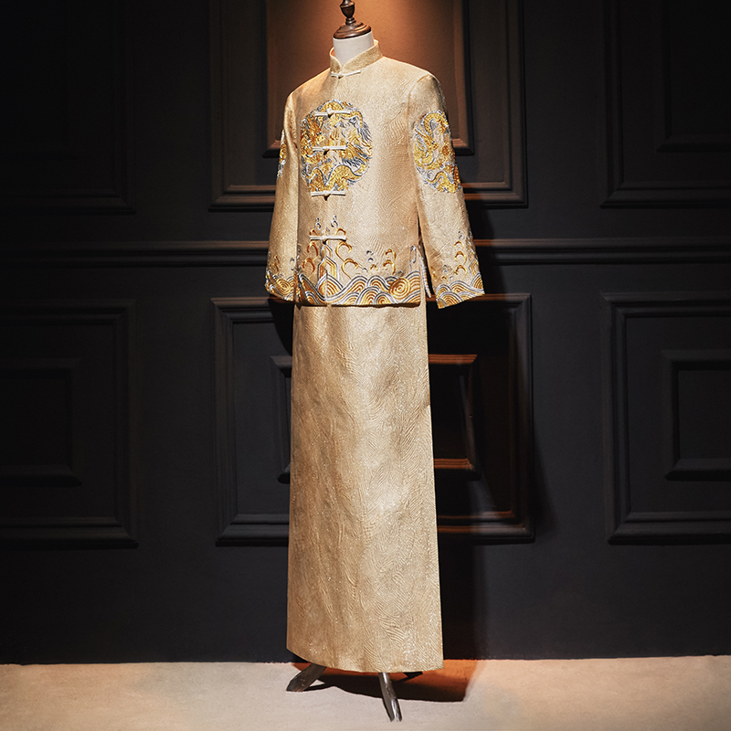 秀禾服男士新郎装中式礼服2023新款香槟色敬酒服龙凤褂男接亲古装