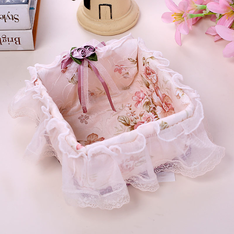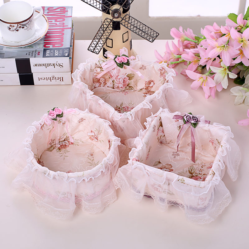 蕾丝布艺手工藤编收纳篮田园布艺遥控篮无格心形家用圆形收纳筐
