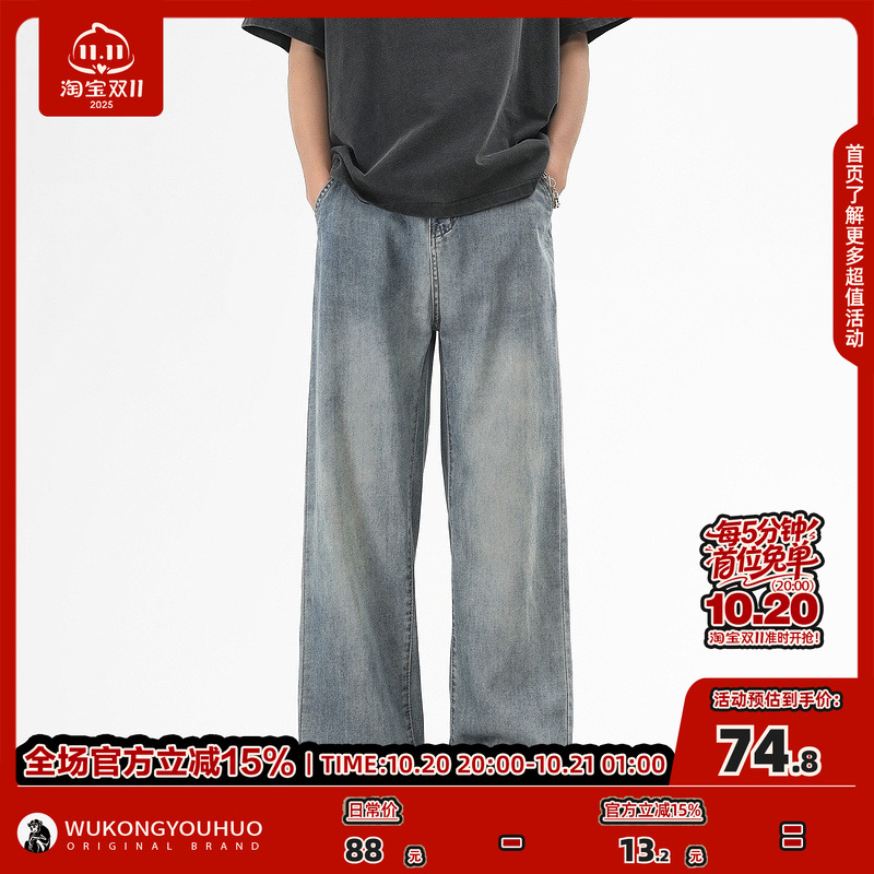 悟空有货美式潮牌水洗直筒牛仔裤男复古宽松基础百搭阔腿休闲长裤