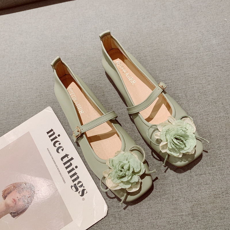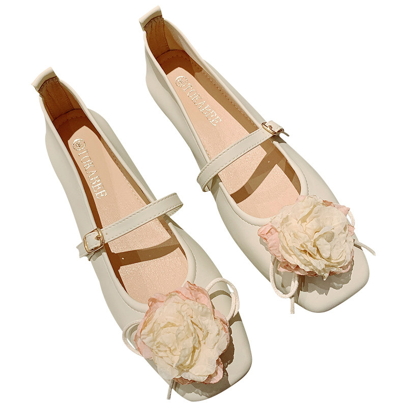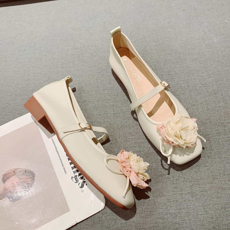 法式花朵装饰一字带软底玛丽珍鞋女2026年新款浅口方头低跟单鞋