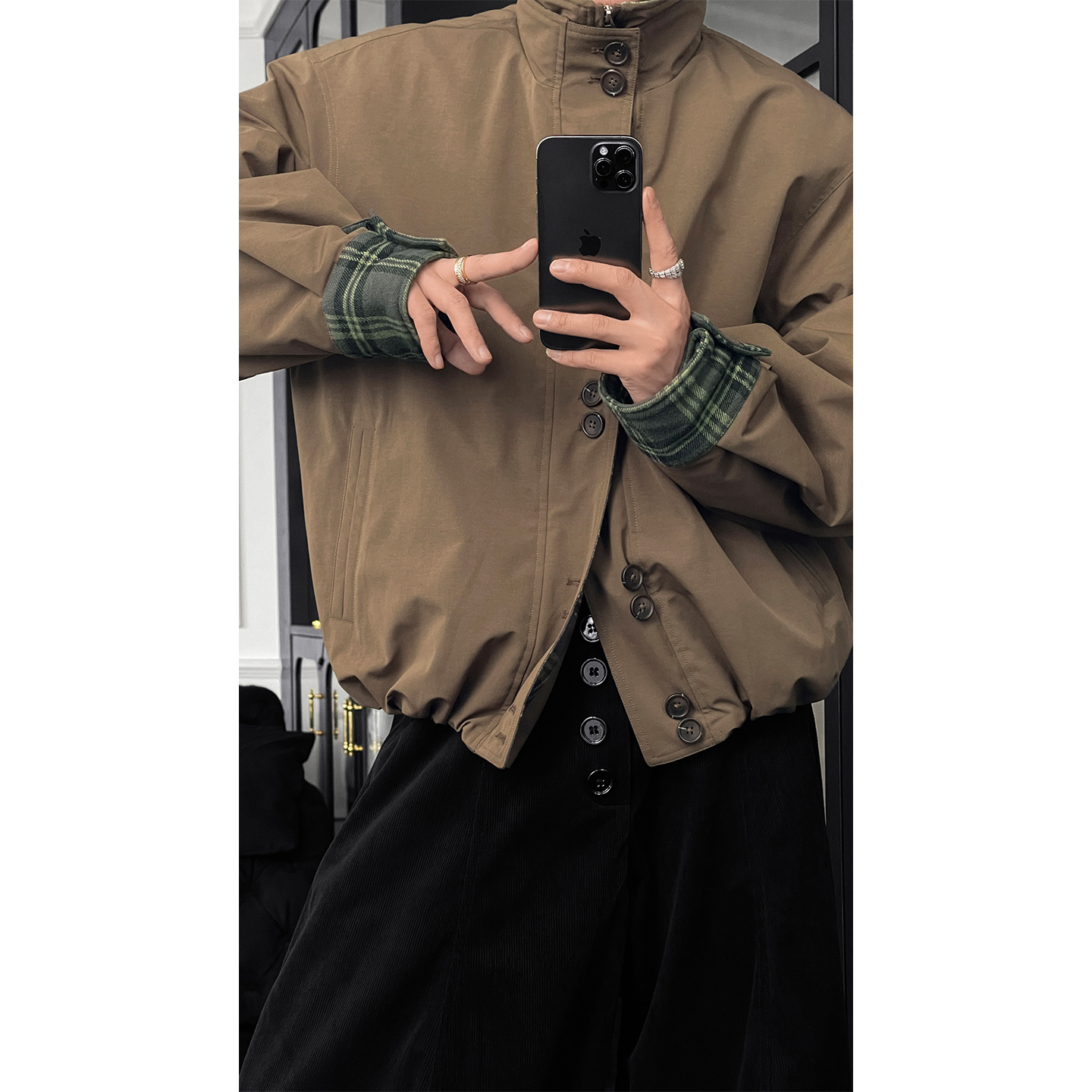 龙叨叨秋冬新品美式复古格纹拼接立领羽绒服男宽松百搭痞帅外套