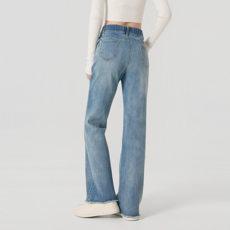 快鱼2025秋季新款女士微紧身牛仔裤磨喇叭裤毛裤脚高腰显瘦长裤子