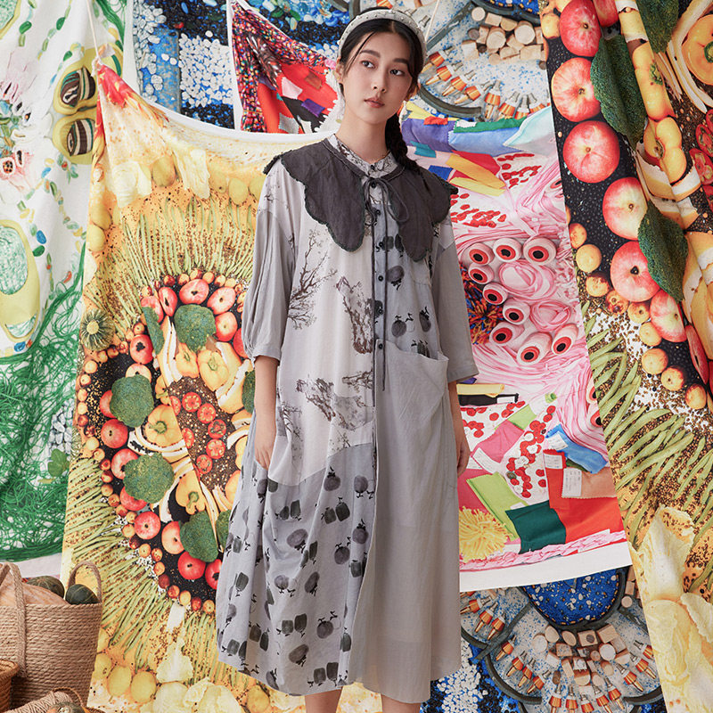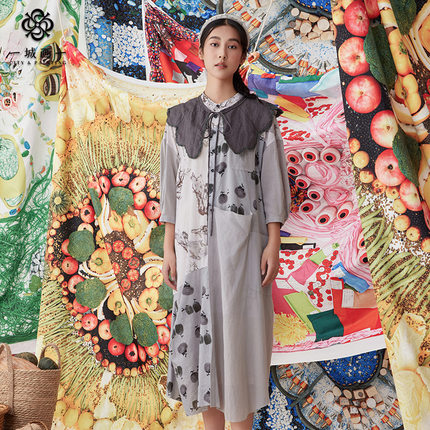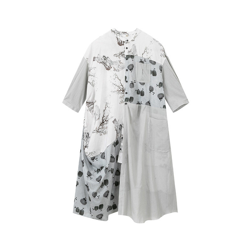 一城画一夏季复古文艺范不规则长款衬衣拼接印花长衬衫女