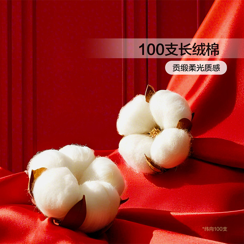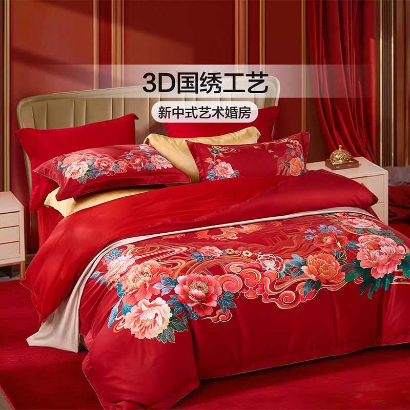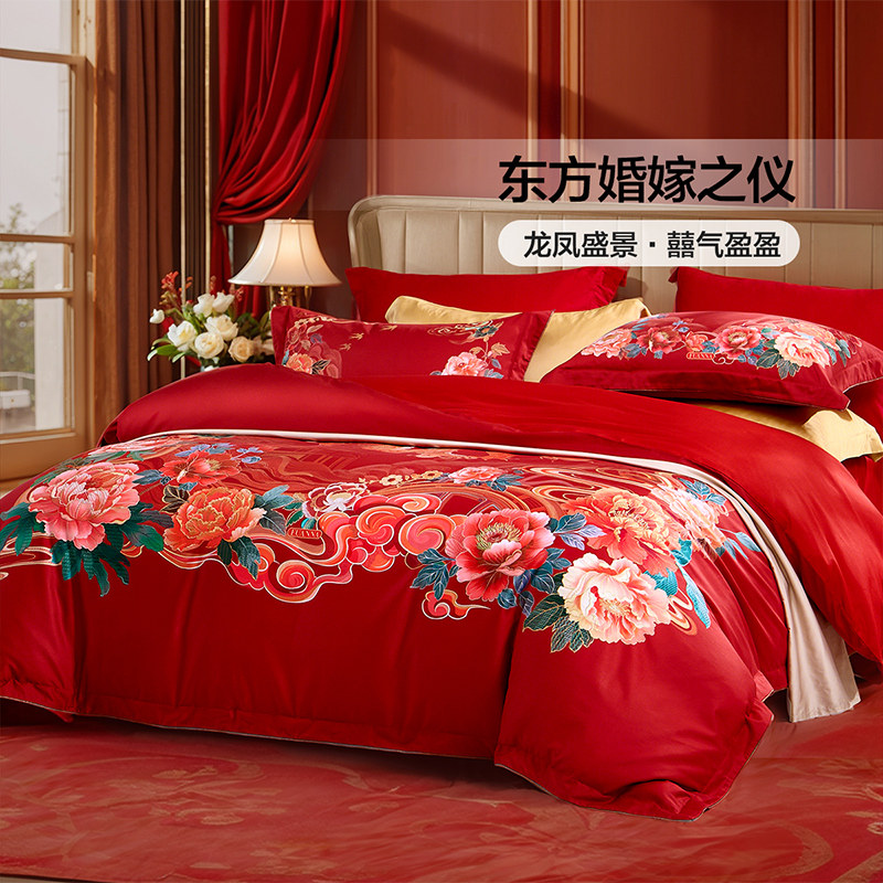 富安娜结婚100支四件套婚庆红色纯棉喜庆床单婚嫁喜被新婚被套