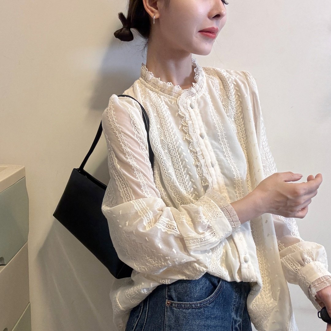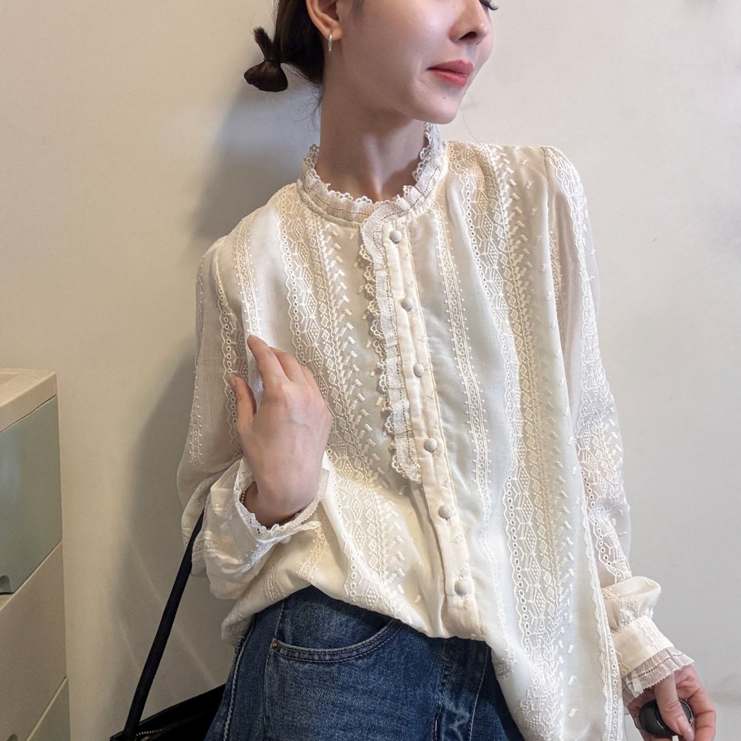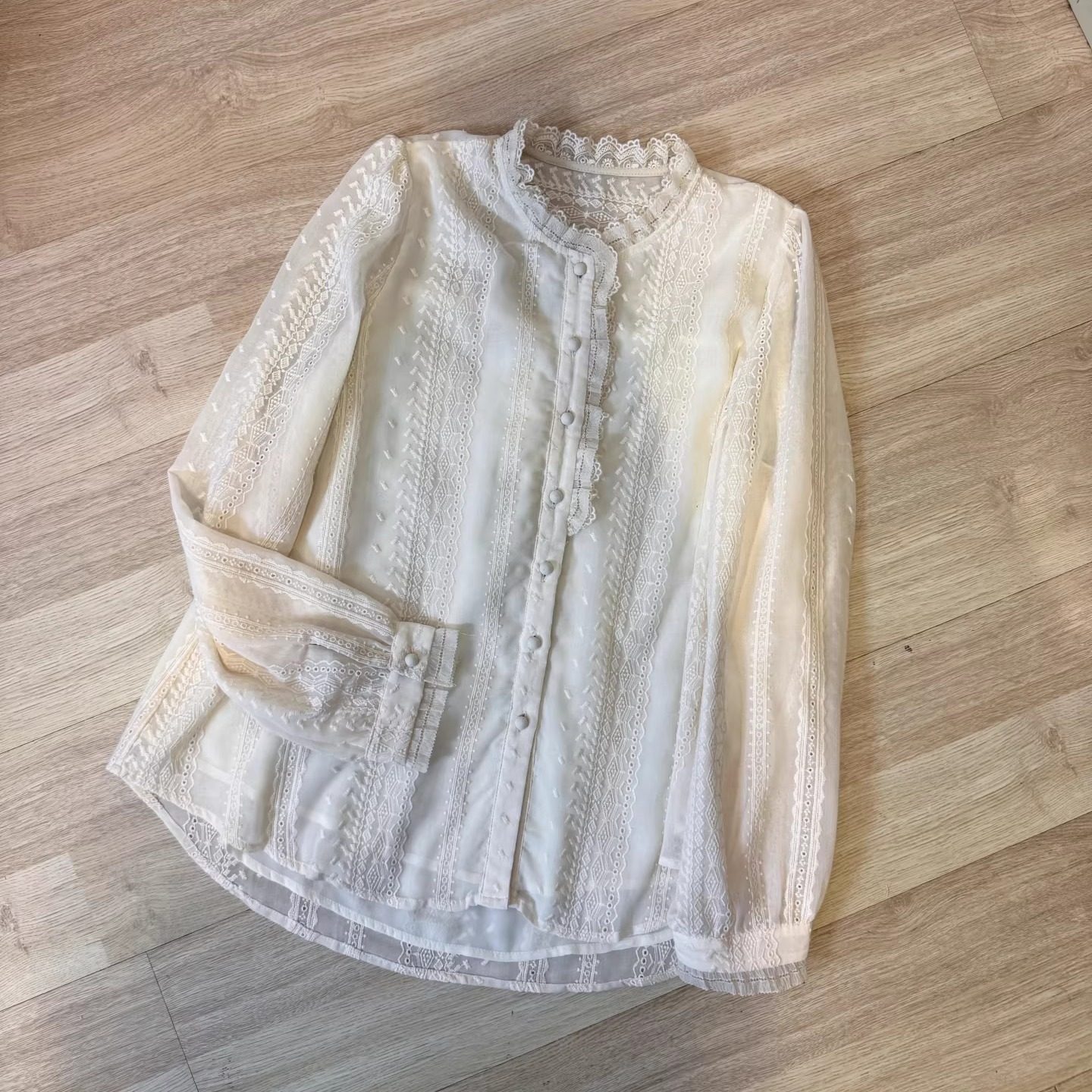 欧洲站2025冬季新款气质女人味蕾丝花边立领衬衫女洋气内搭上衣