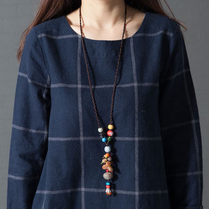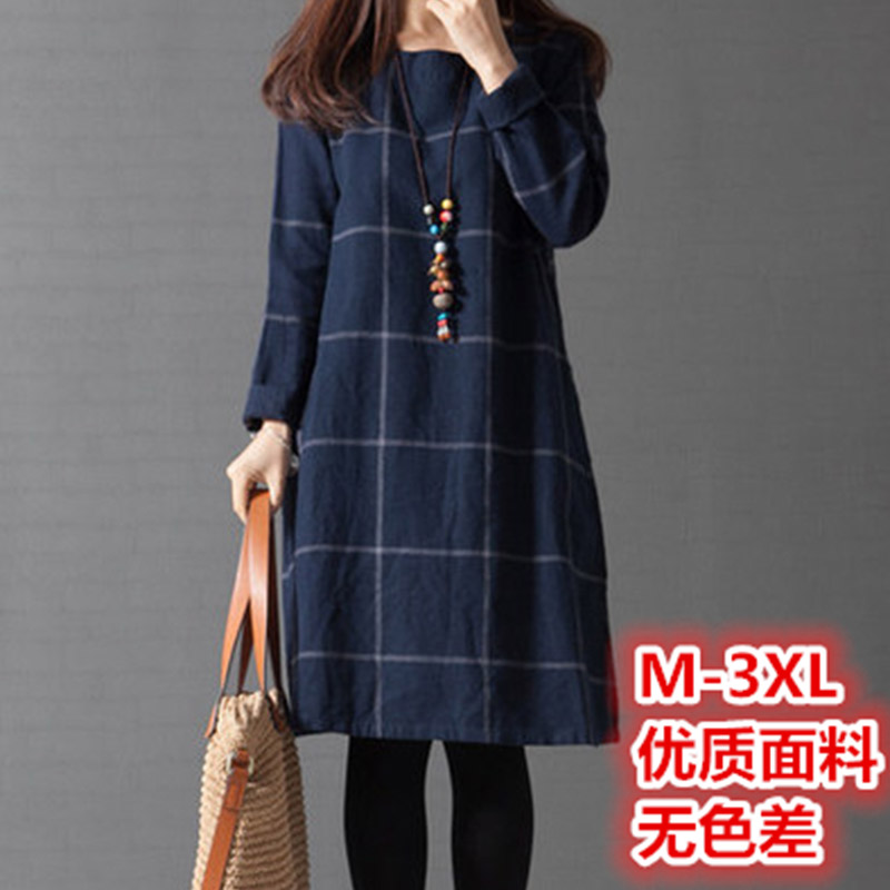 2024春秋新款韩版女装中长棉麻连衣裙宽松大码亚麻格子长袖A字裙