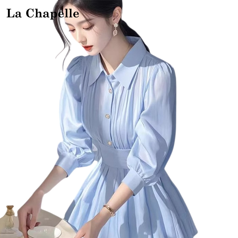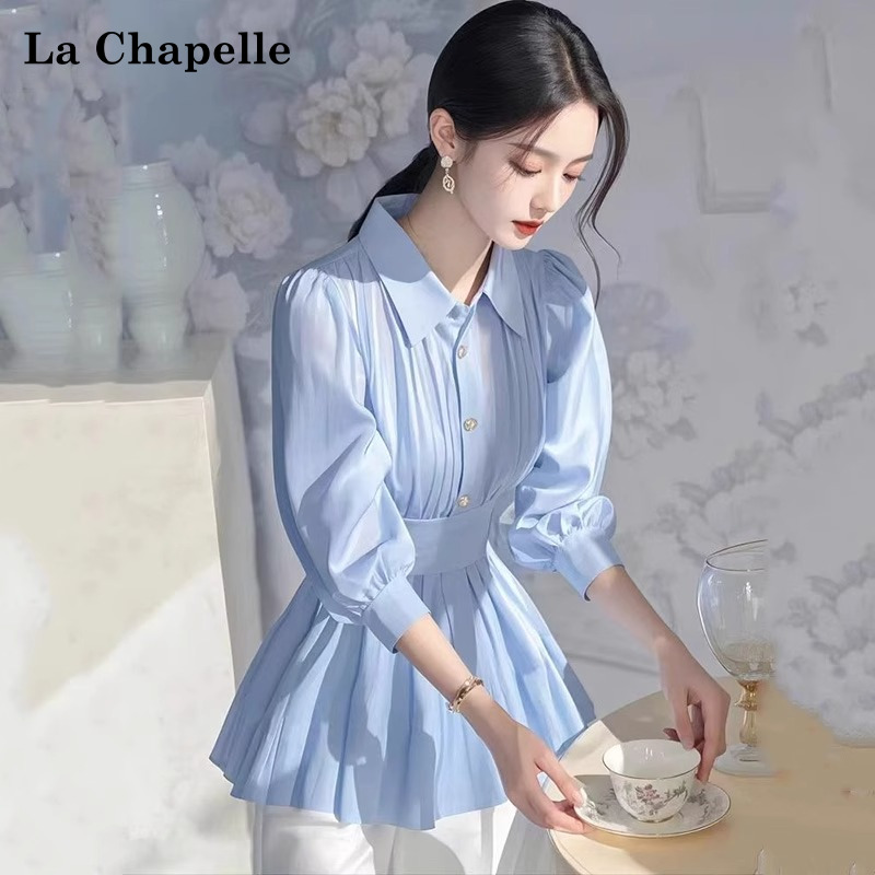 拉夏贝尔法式蓝色长袖衬衫女夏季新款高级感别致收腰显瘦小衫上衣