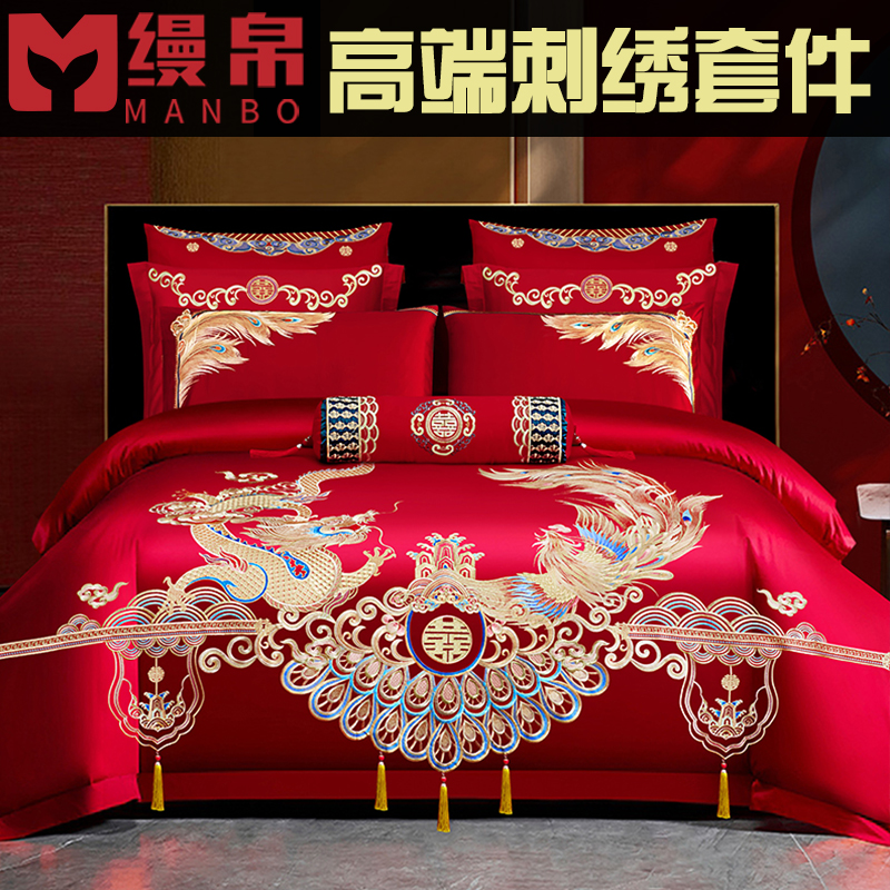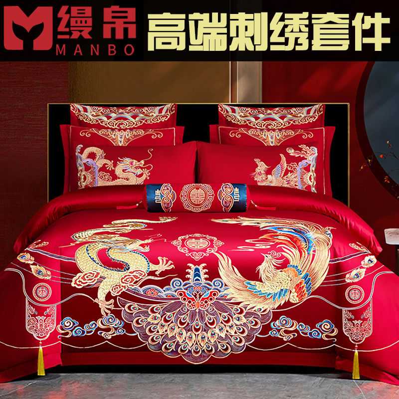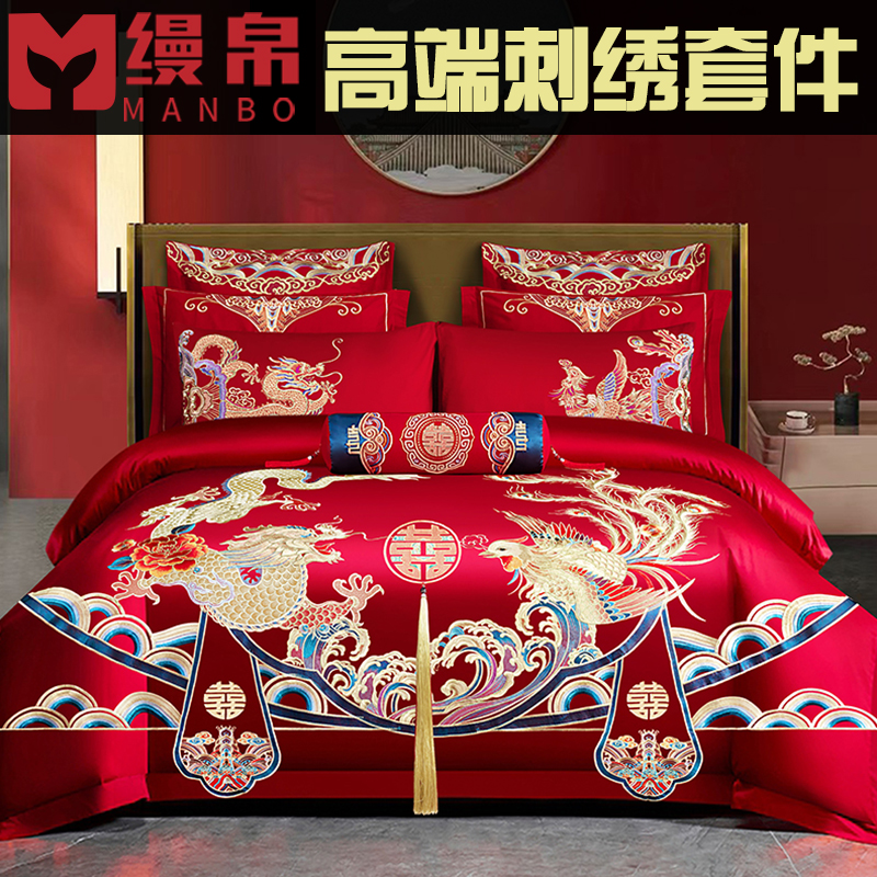 缦帛结婚四件套婚床上用品大红色新婚婚庆床品六件套刺绣婚嫁喜被