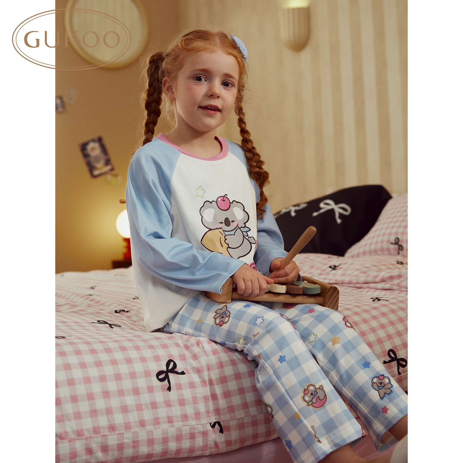 Gukoo/果壳睡衣儿童春秋款考拉印花新款纯棉可爱女童家居服套装A