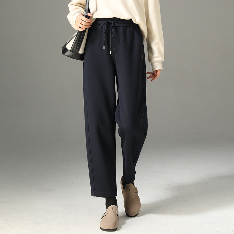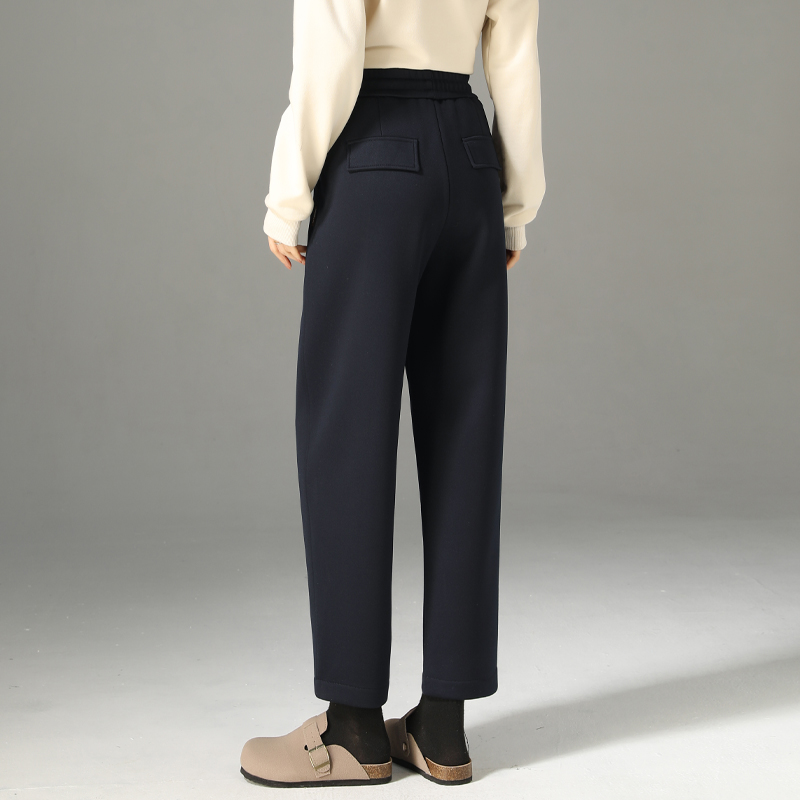藏青色哈伦裤女2025冬季新款高腰加绒休闲毛呢裤子秋冬九分萝卜裤