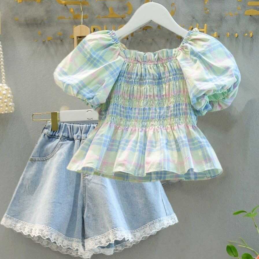 女童夏装泡泡袖衬衫2024新款儿童格子娃娃衫中大童牛仔短裤两件套
