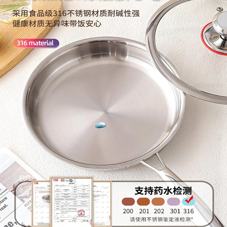 无涂层316L不锈钢不粘锅家用平底煎锅牛排煎蛋炒锅燃气电磁炉专用