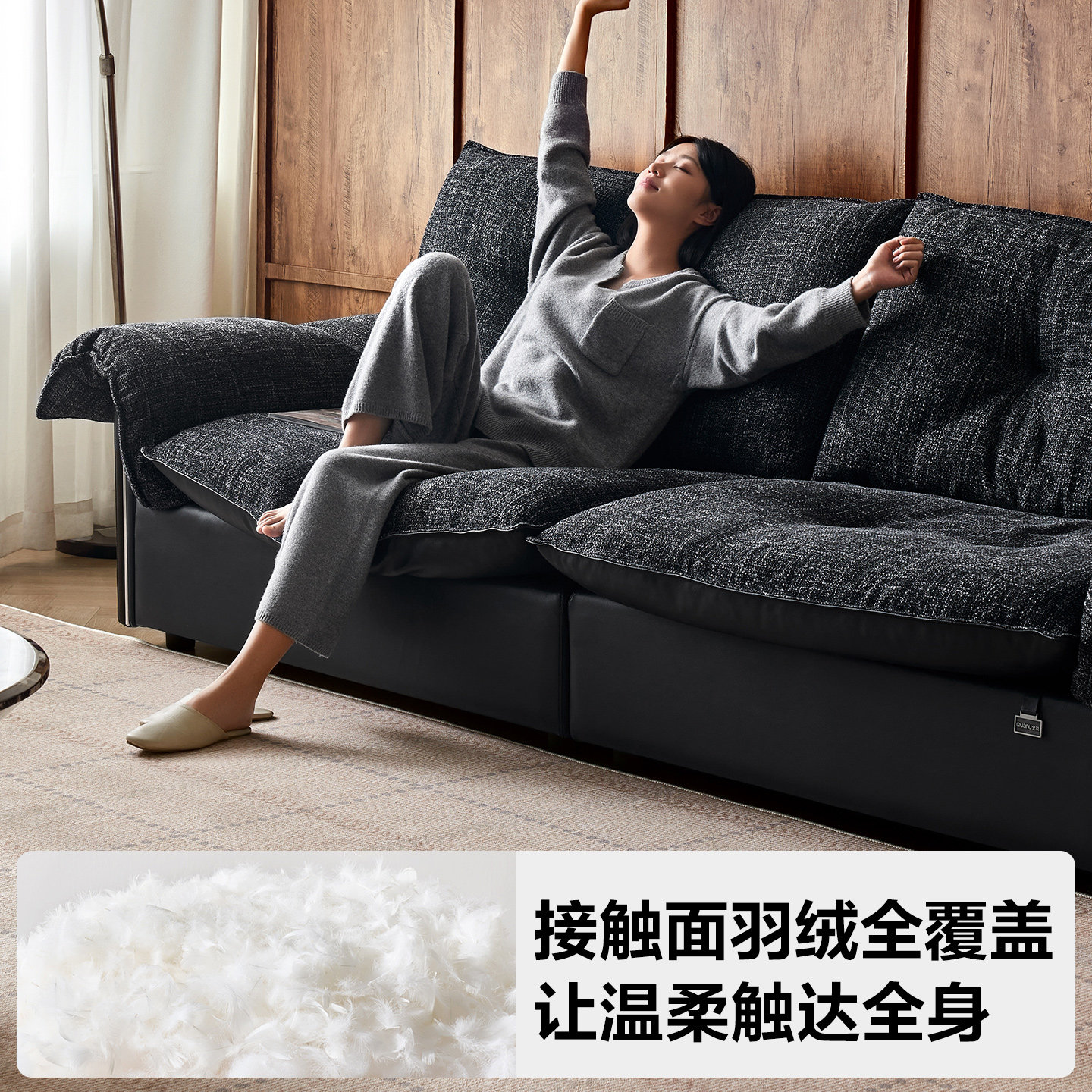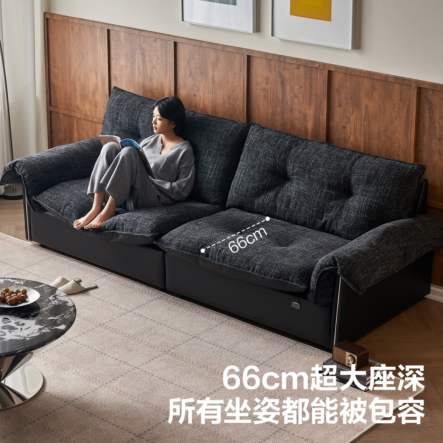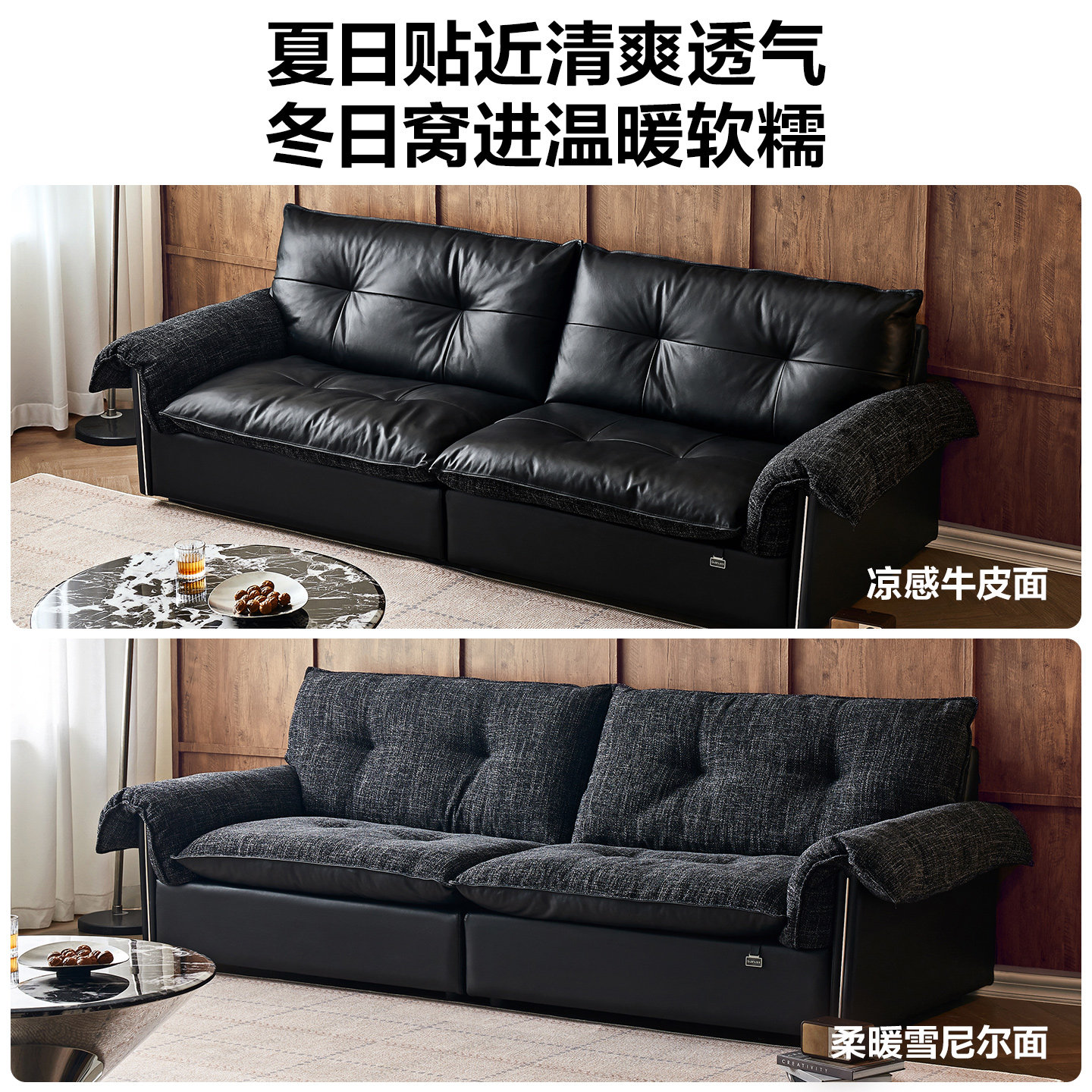 全友家居中古风黑色布艺真皮沙发两用小户型客厅2025新款黑色家具