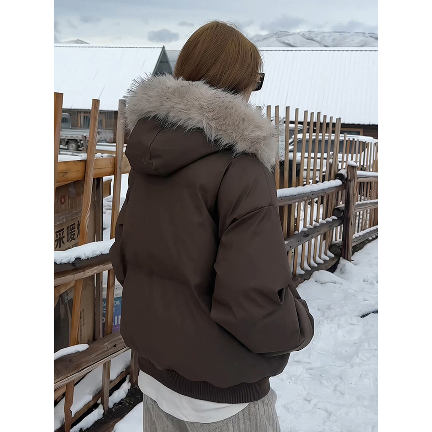 可拆卸毛领pu皮羽绒棉服男女冬季加厚保暖连帽外套美式短款面包服