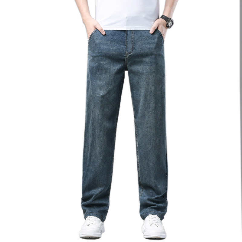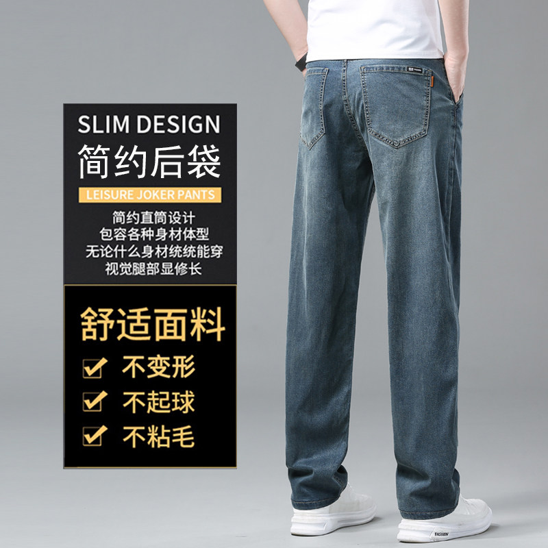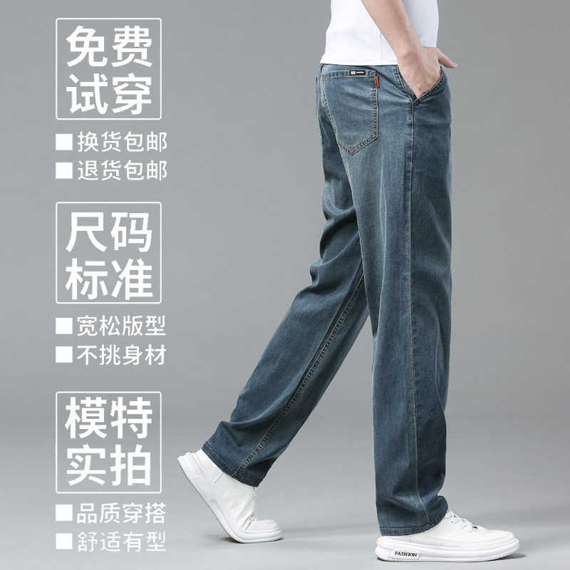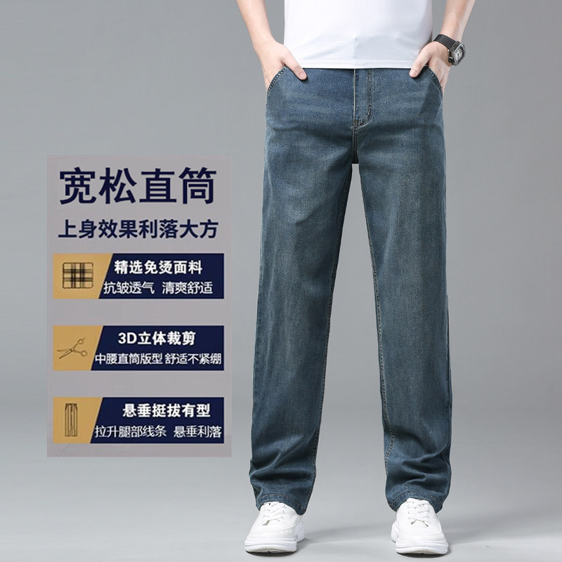 复古蓝天丝牛仔裤男超薄弹力直筒宽松阔腿大码夏天薄款冰丝男裤子
