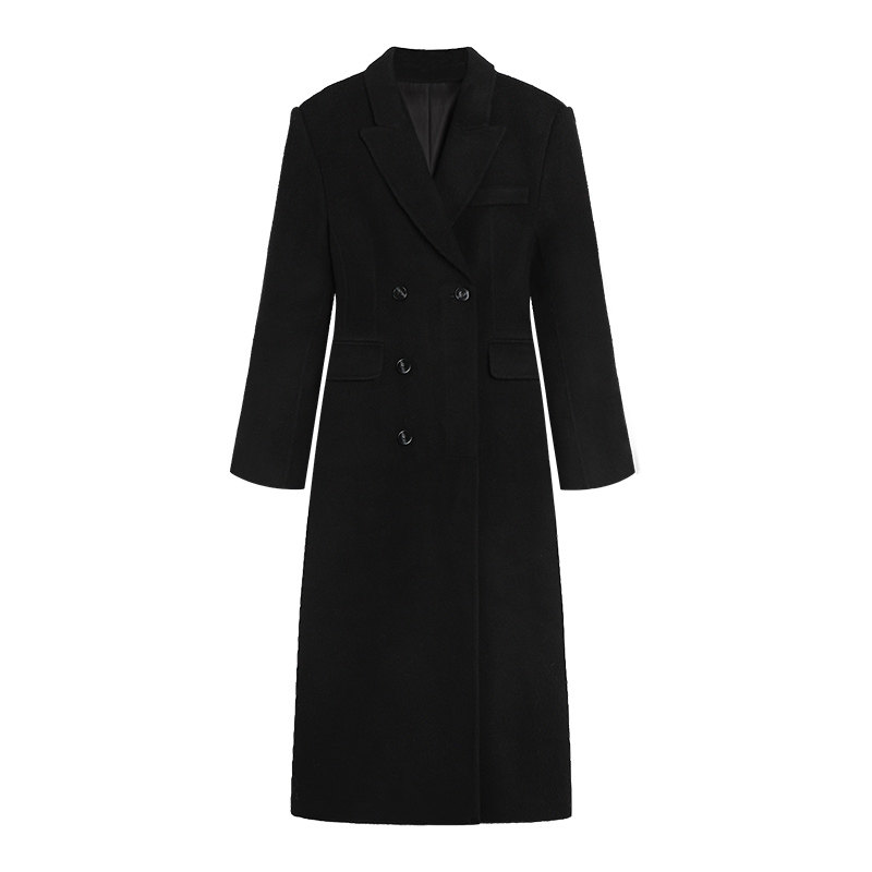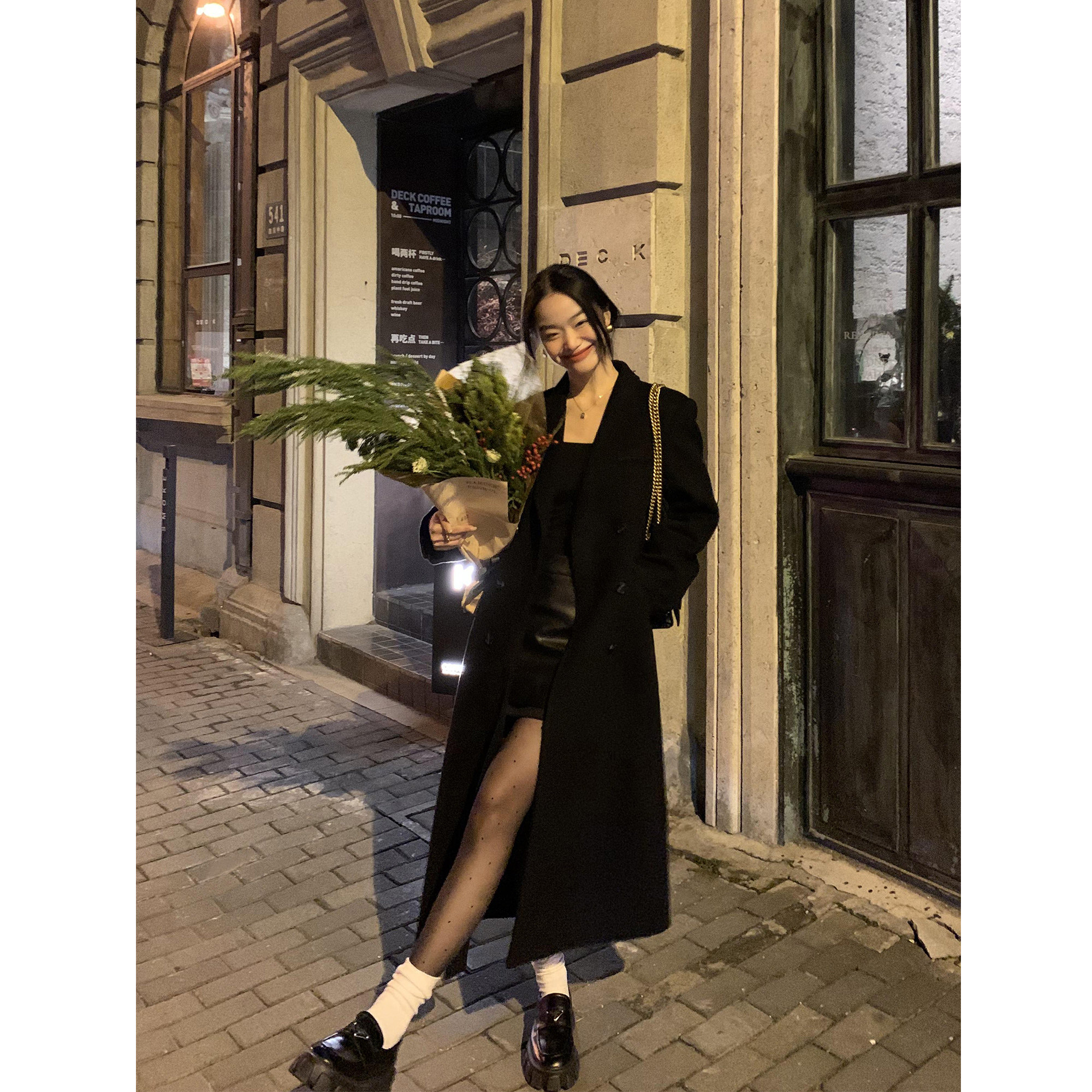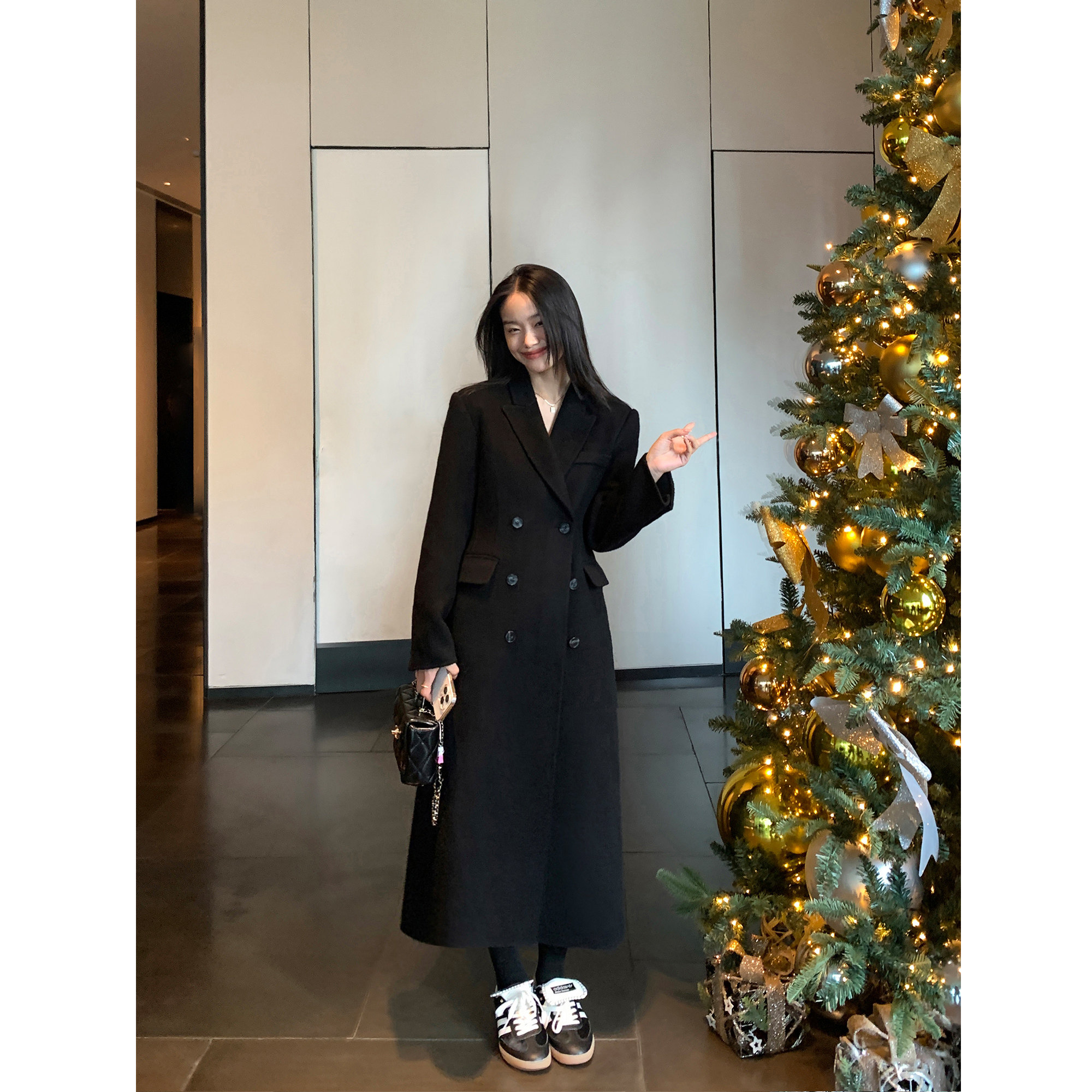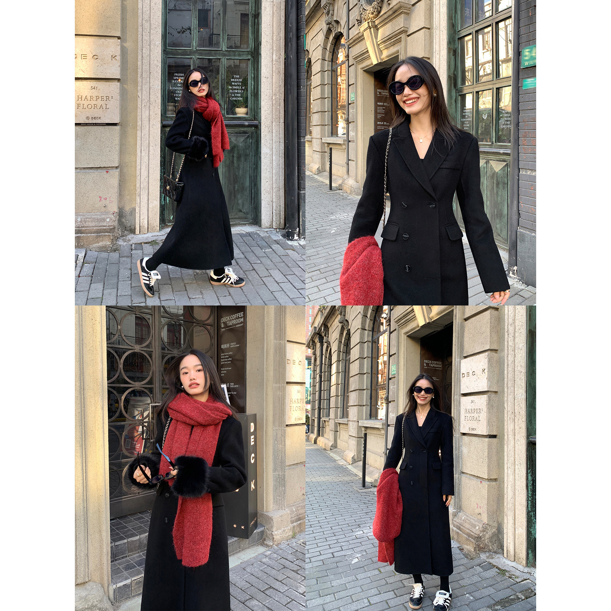 pusumede黑色100羊毛双面呢大衣女收腰中长款法式高级感毛呢外套