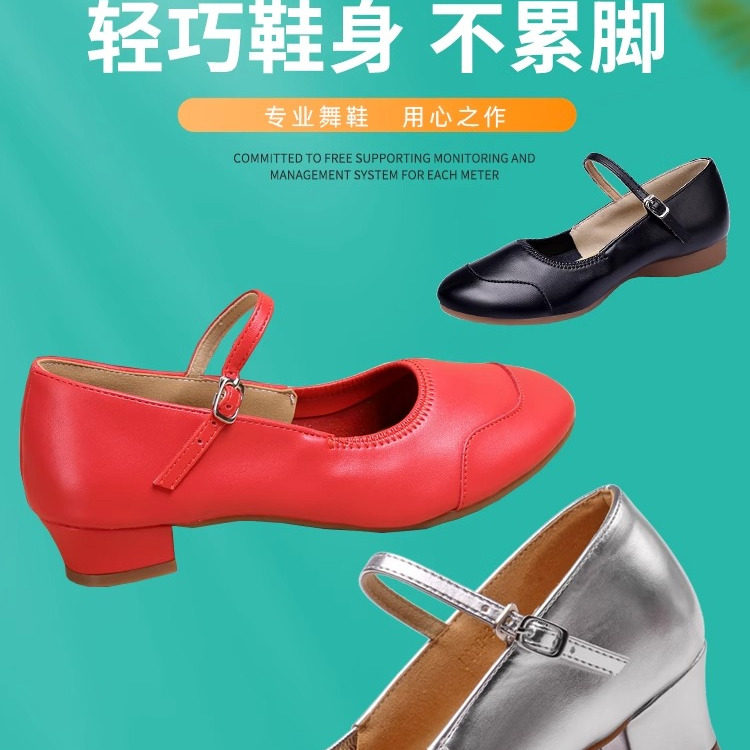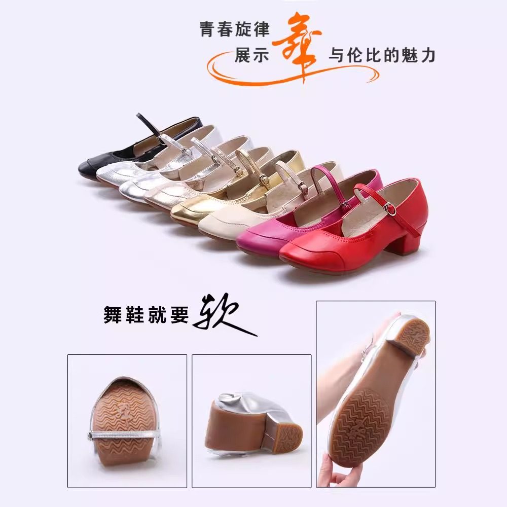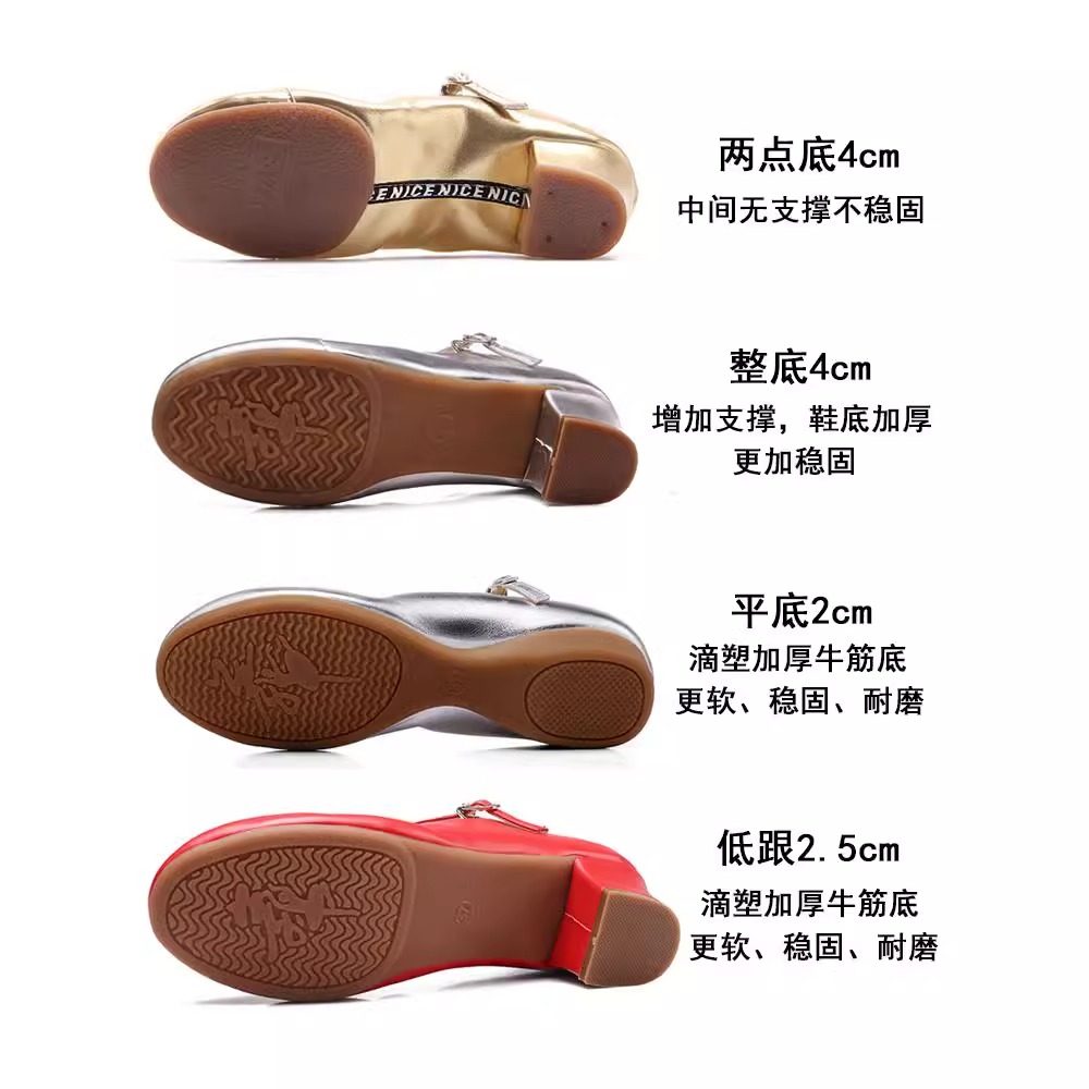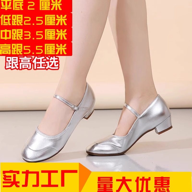 儿童标准跳舞鞋广场舞鞋真皮中跟银色舞蹈鞋软底中老年演出鞋女鞋