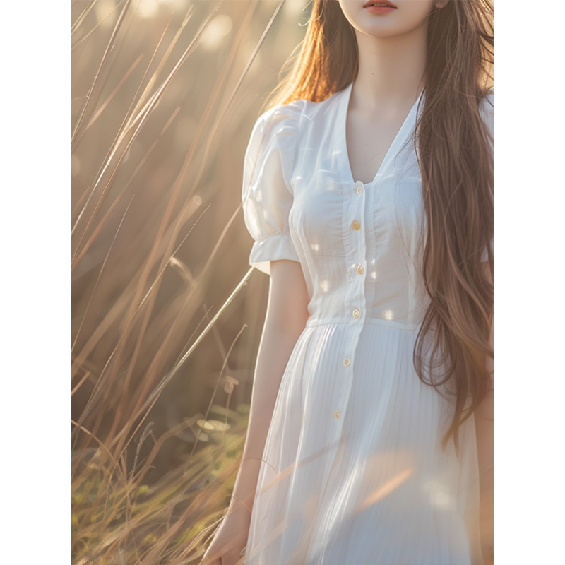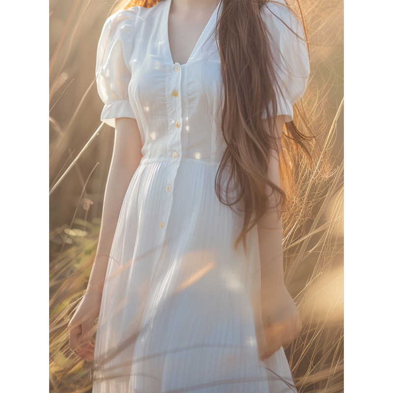 法式白色V领短袖连衣裙女2025年夏季新款高级感收腰a字泡泡袖裙子