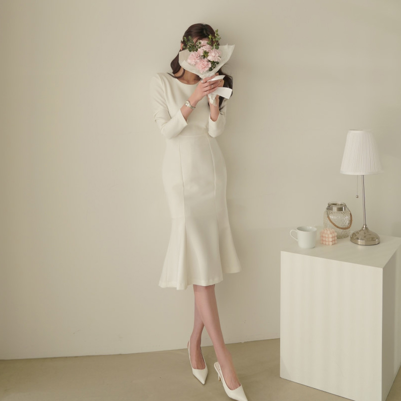 B家自制韩版长袖气质鱼尾裙修身长裙白色领证宴会连衣裙多色春秋