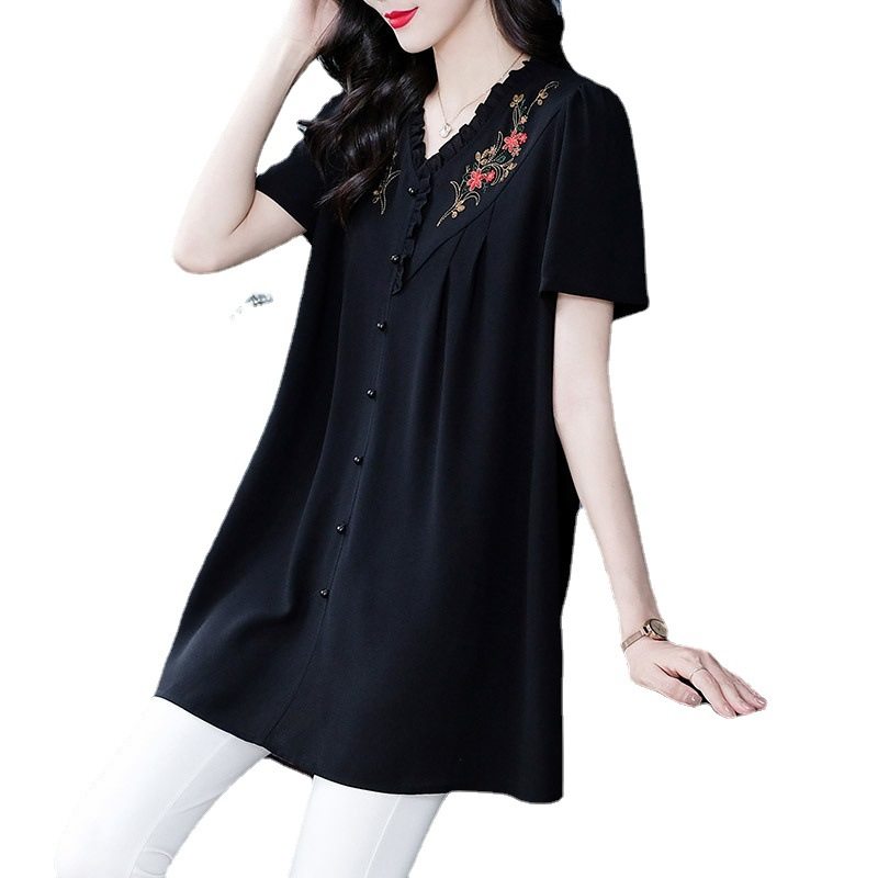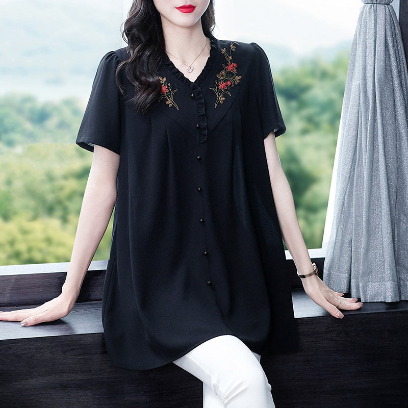240斤宽松复古刺绣减龄边短袖衬衫上衣胖子MM中老年女装雪纺休闲