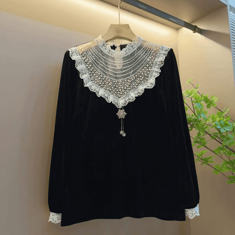 加大码女装网纱钉珠蕾丝边拼接上衣胖妹妹法式公主风重工显瘦小衫