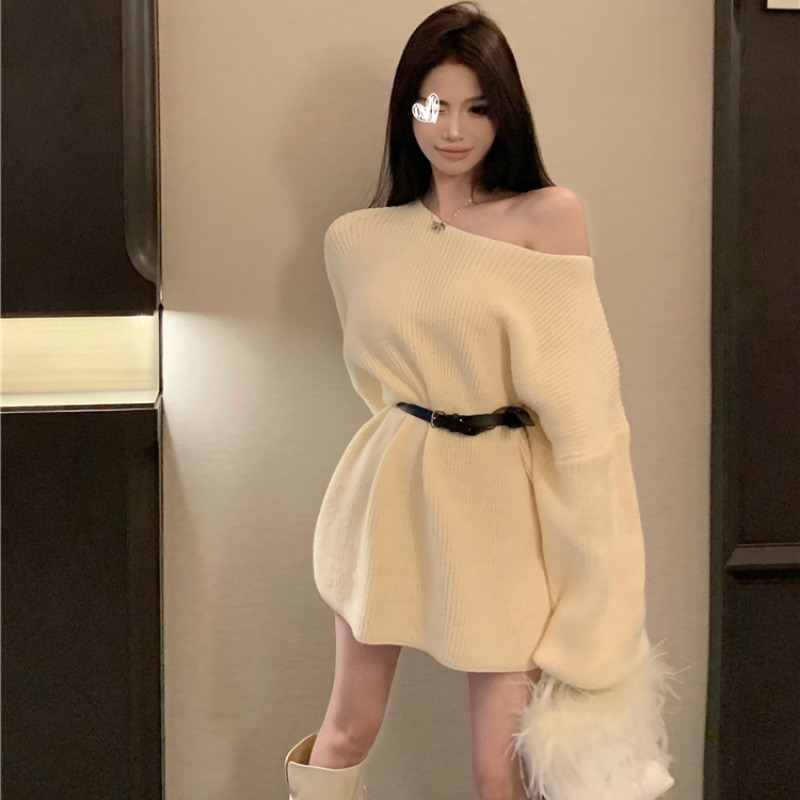 气质甜美露肩针织连衣裙宽松长袖显瘦短裙配腰带通勤气质针织衫