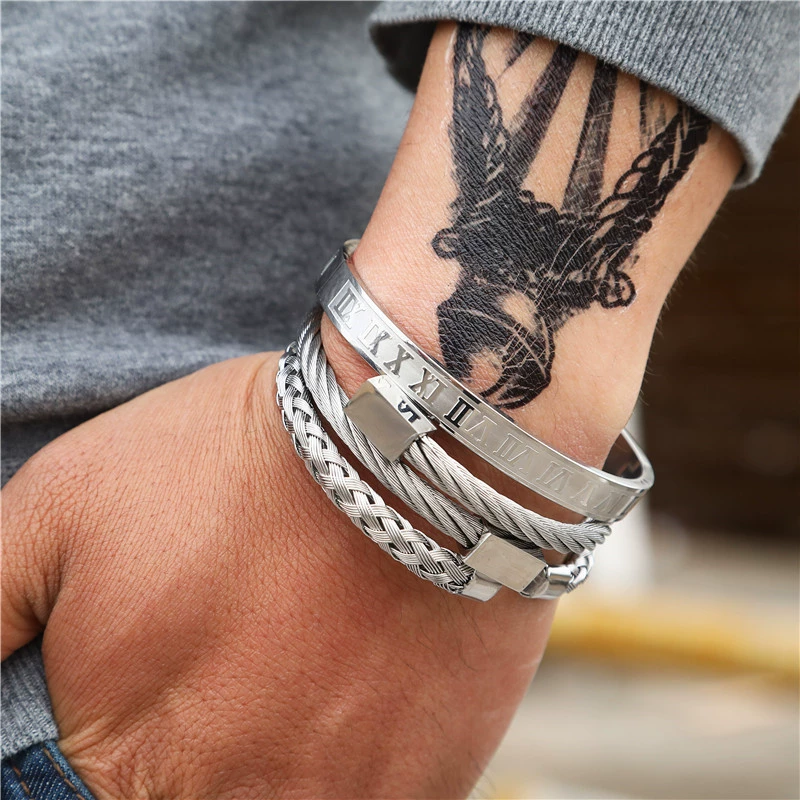 欧美潮牌罗马数字编织开口手镯手链男士钛钢轻奢简约流行百搭手饰