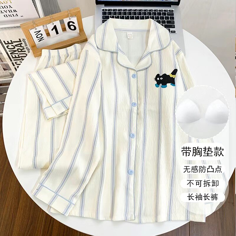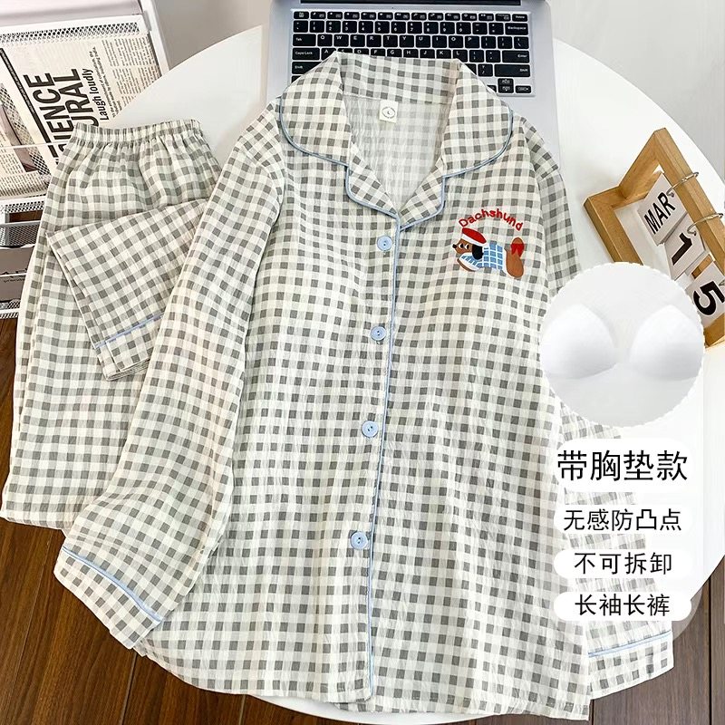 带胸垫睡衣女云朵棉防凸点高档少女家居服学生款可外穿格子加大码