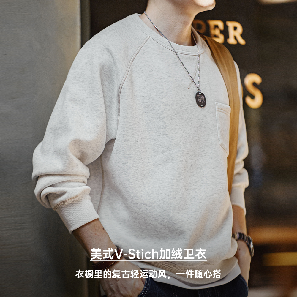 马登工装美式复古重磅圆领加绒卫衣休闲运动加厚保暖上衣男秋冬季