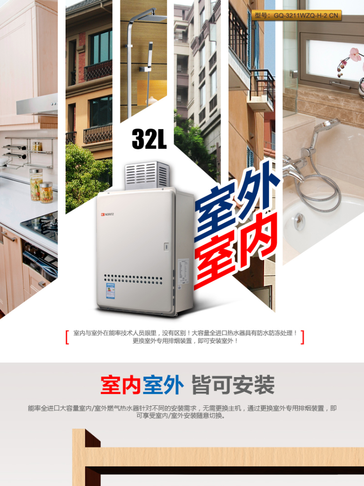 NORITZ/能率 GQ-3211WZQ-H-2 CN室内/室外自由安装32升燃气热水器