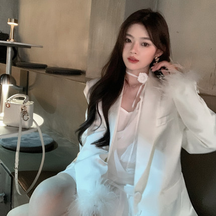 ByYou 秋冬新款喇叭袖翻领白色衬衫连衣裙收腰短裙含吊带裙两件套