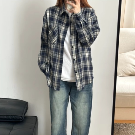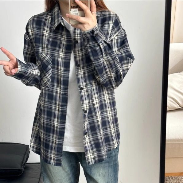 美式复古格子衬衫秋季新款情侣日常通勤宽松百搭衬衣穿搭外套