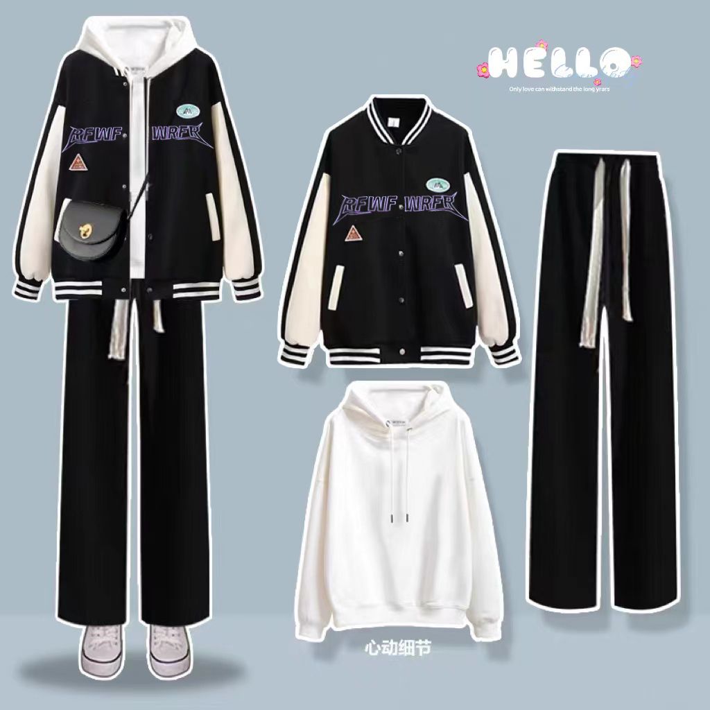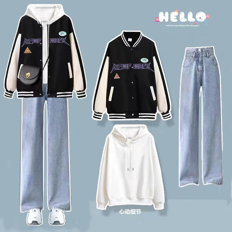 春秋套装棒球服女外套宽松长袖卫衣上衣休闲牛仔裤子学院风三件套
