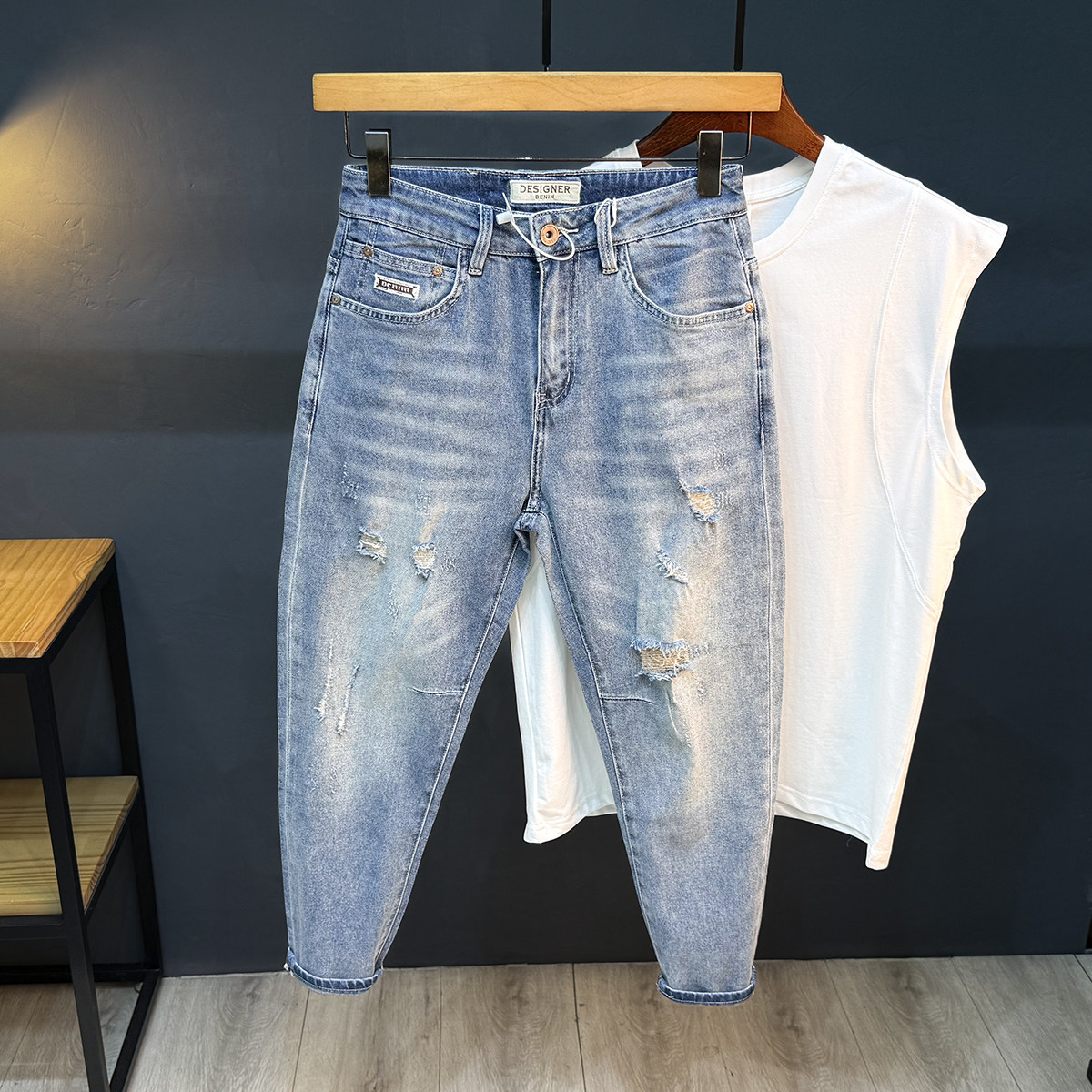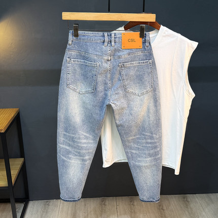 香港夏季八分九分小个子牛仔裤男宽松小脚薄款破洞9分休闲百搭裤