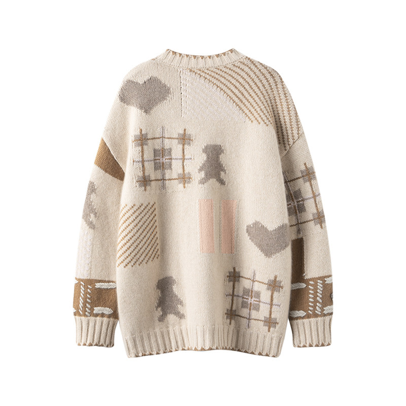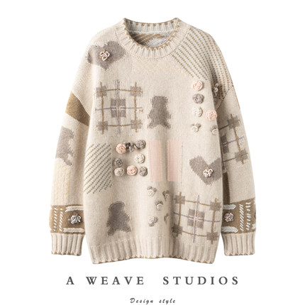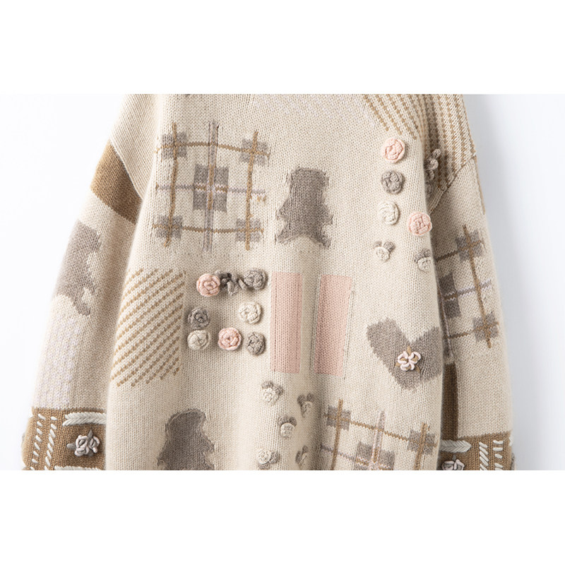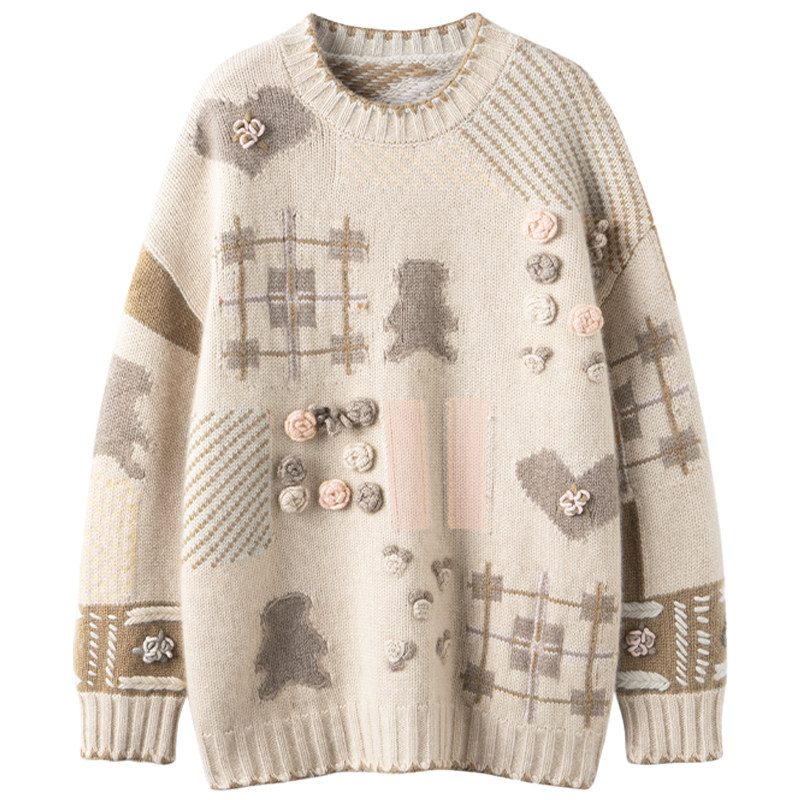 把可爱拿捏住了!新款圆领手工摇花小熊100%纯山羊绒套头衫女