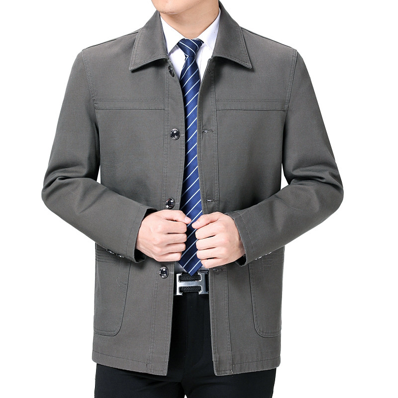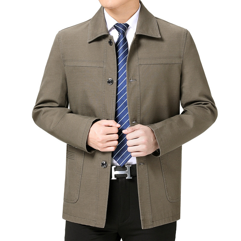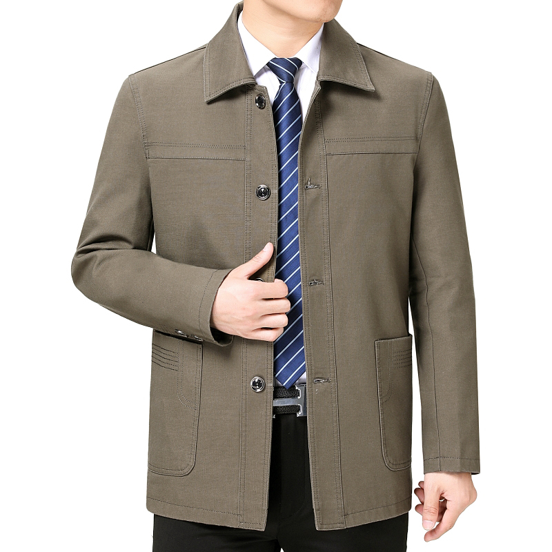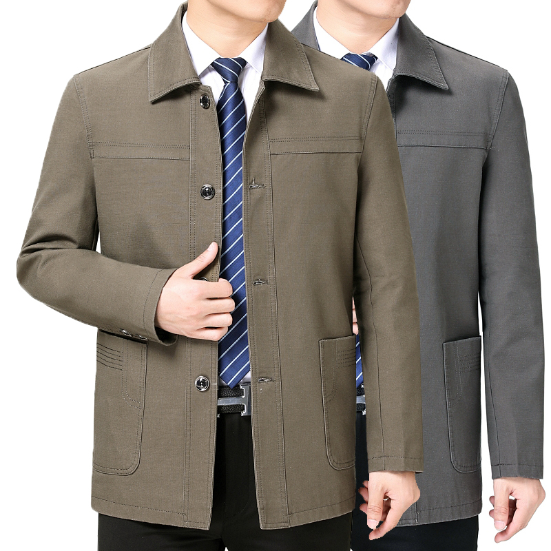 春秋季中年纯棉夹克爸爸装宽松休闲中老年男士翻领加大码上衣外套